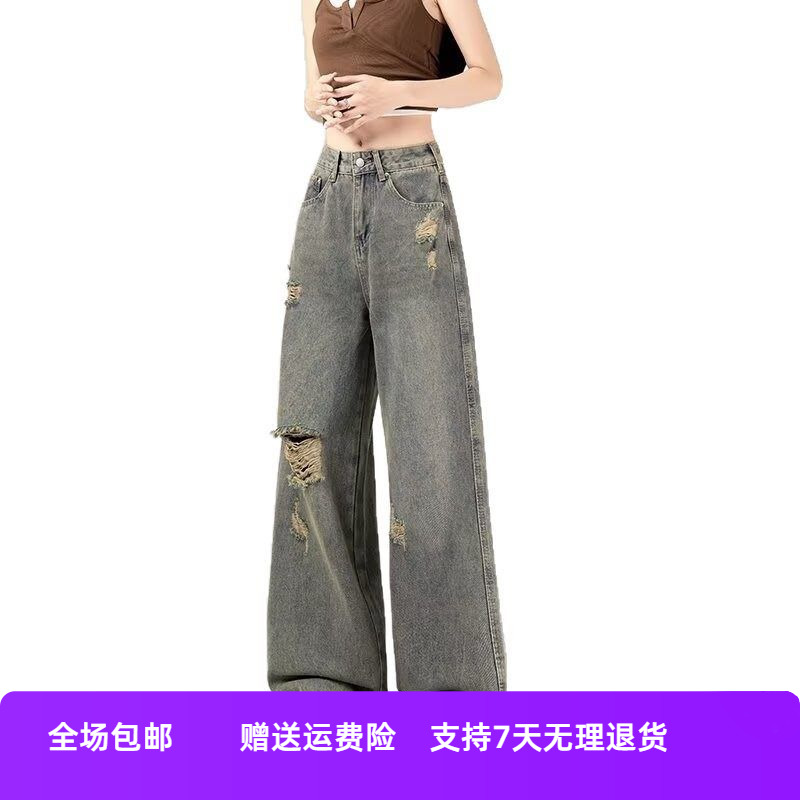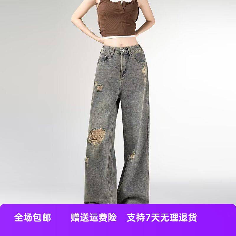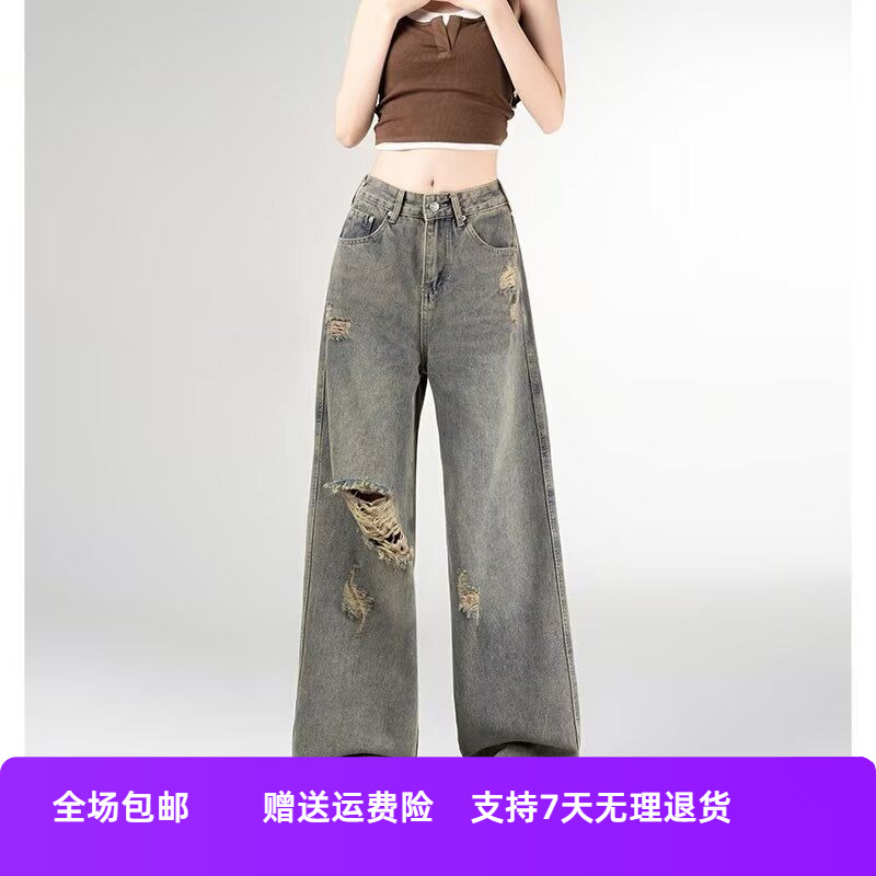 小个子破洞女百搭设计感宽松阔腿牛仔裤新款复古夏季长裤直筒高腰
