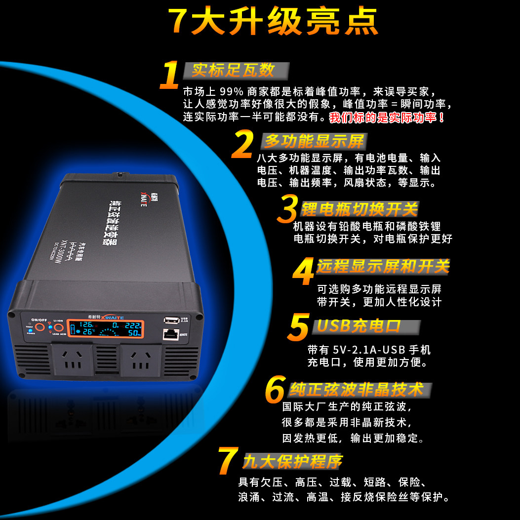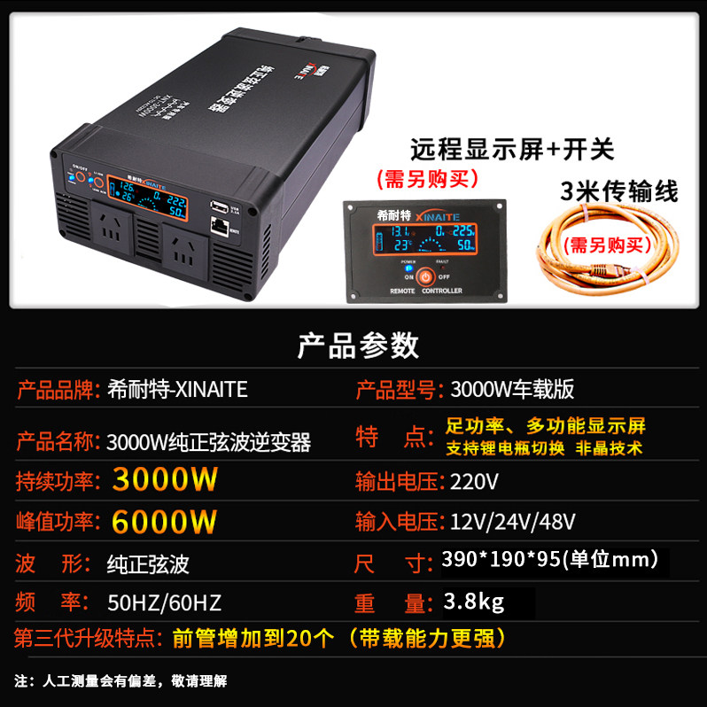 希耐特纯正弦波逆变器12v24v48V转220v房货车载3000W大功率转换器
