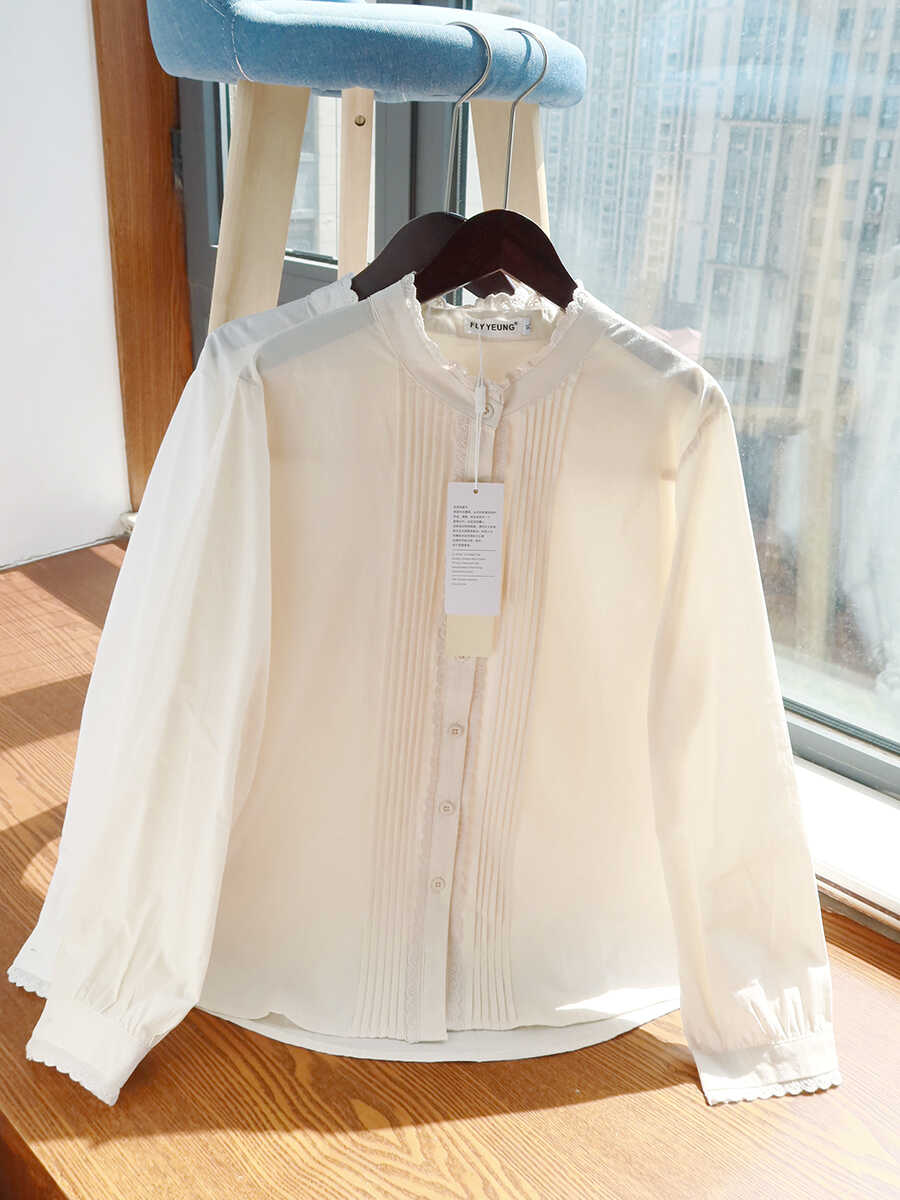 大码白衬衫女200斤胖mm长袖春装高级感正肩薄款纯棉花边立领衬衣