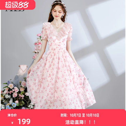 艾丽丝2025夏季新款法式浪漫粉色碎花连衣裙女仙气甜美减龄公主裙
