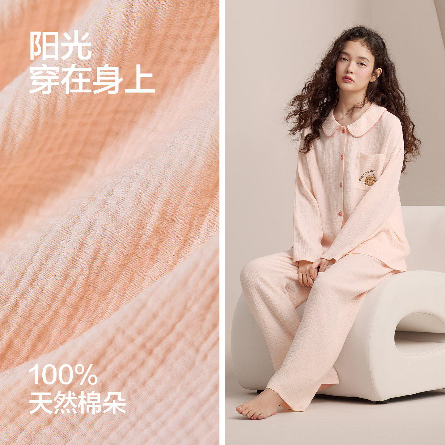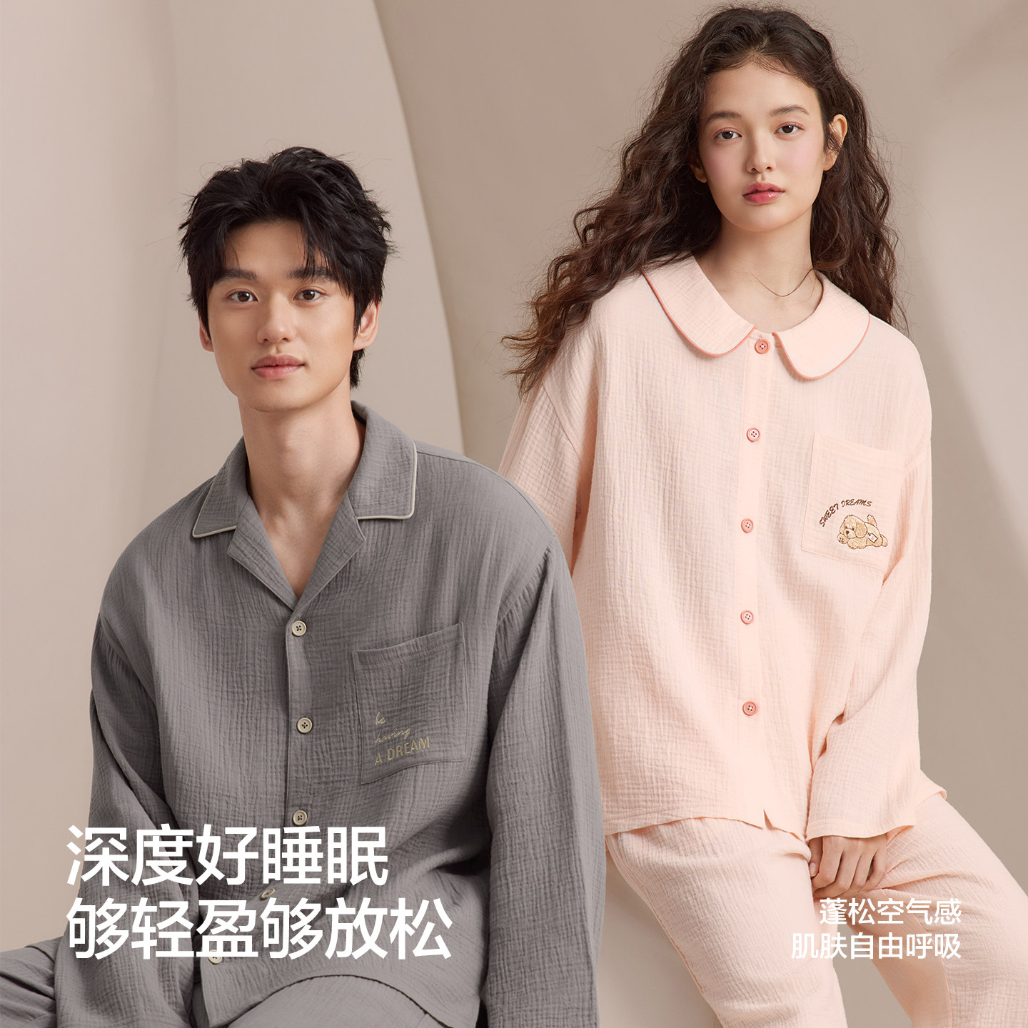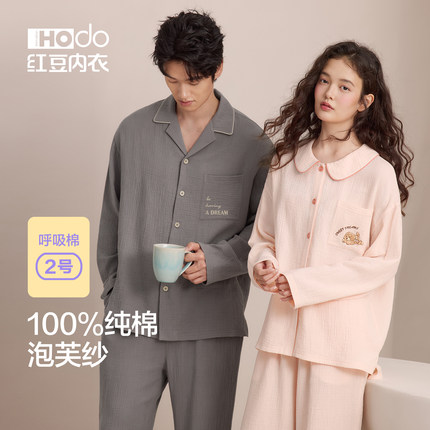 红豆情侣纯棉睡衣长袖男士春夏款女梭织双层纱透气A类家居服套装