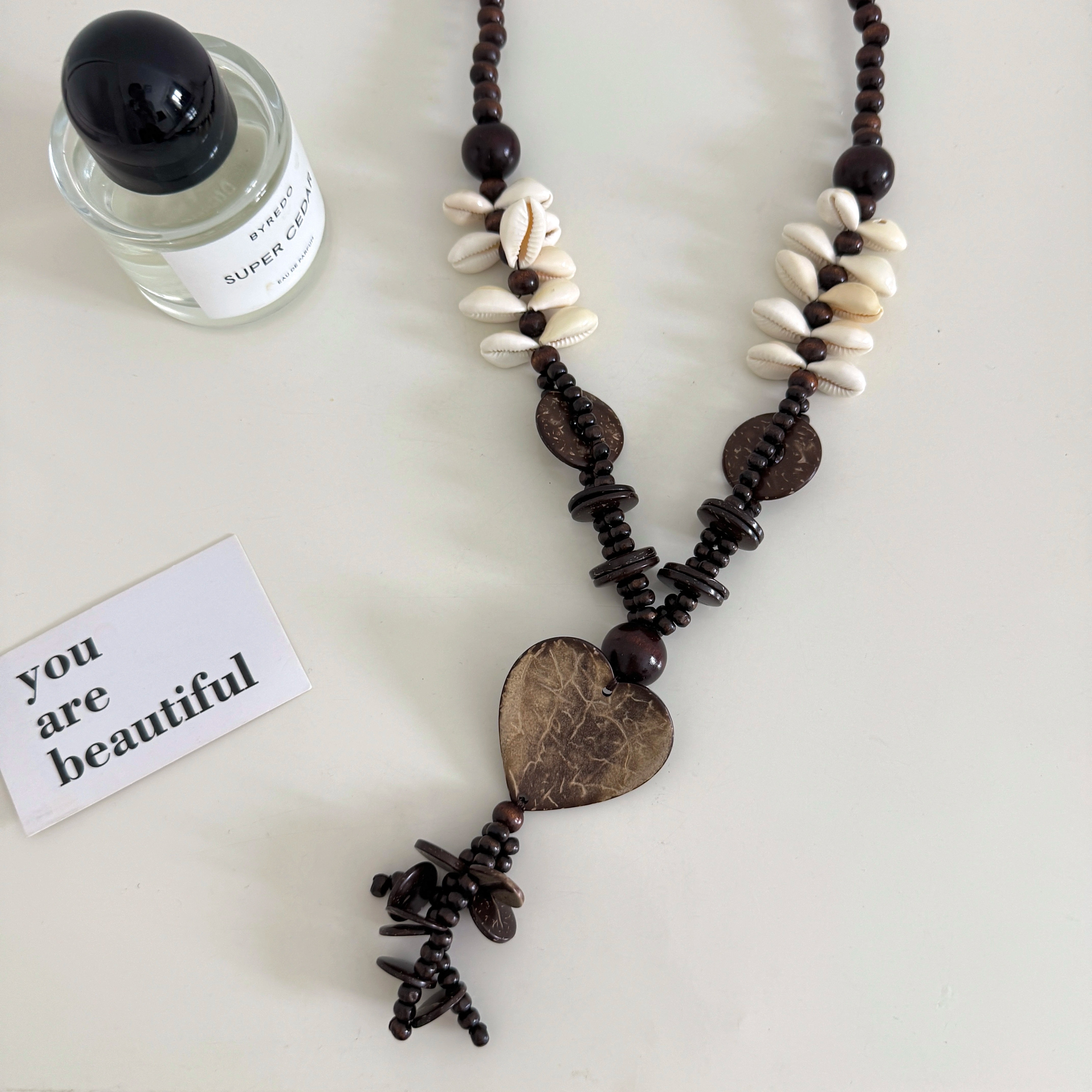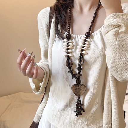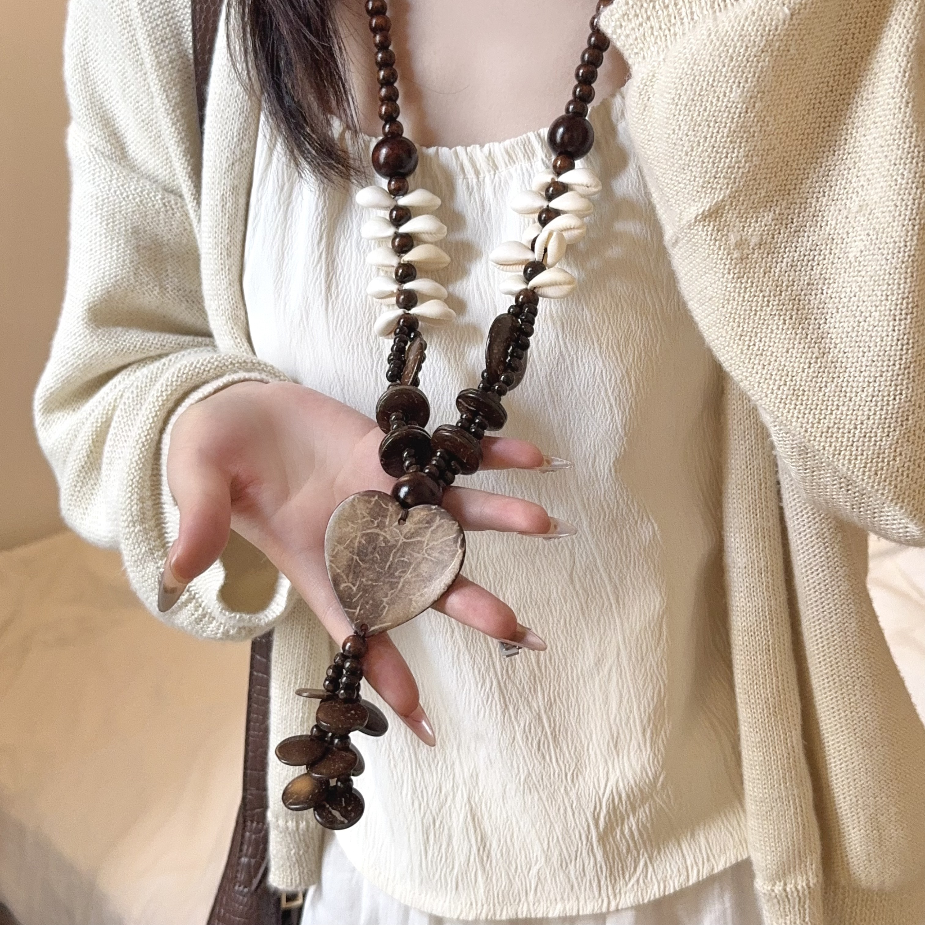 复古波西米亚民族风木质爱心流苏项链手工椰壳多层吊坠长款毛衣链