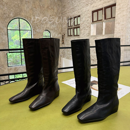 ido真皮长筒靴女2025秋季新款百搭粗跟方头显瘦英伦风复古骑士靴