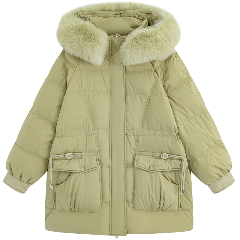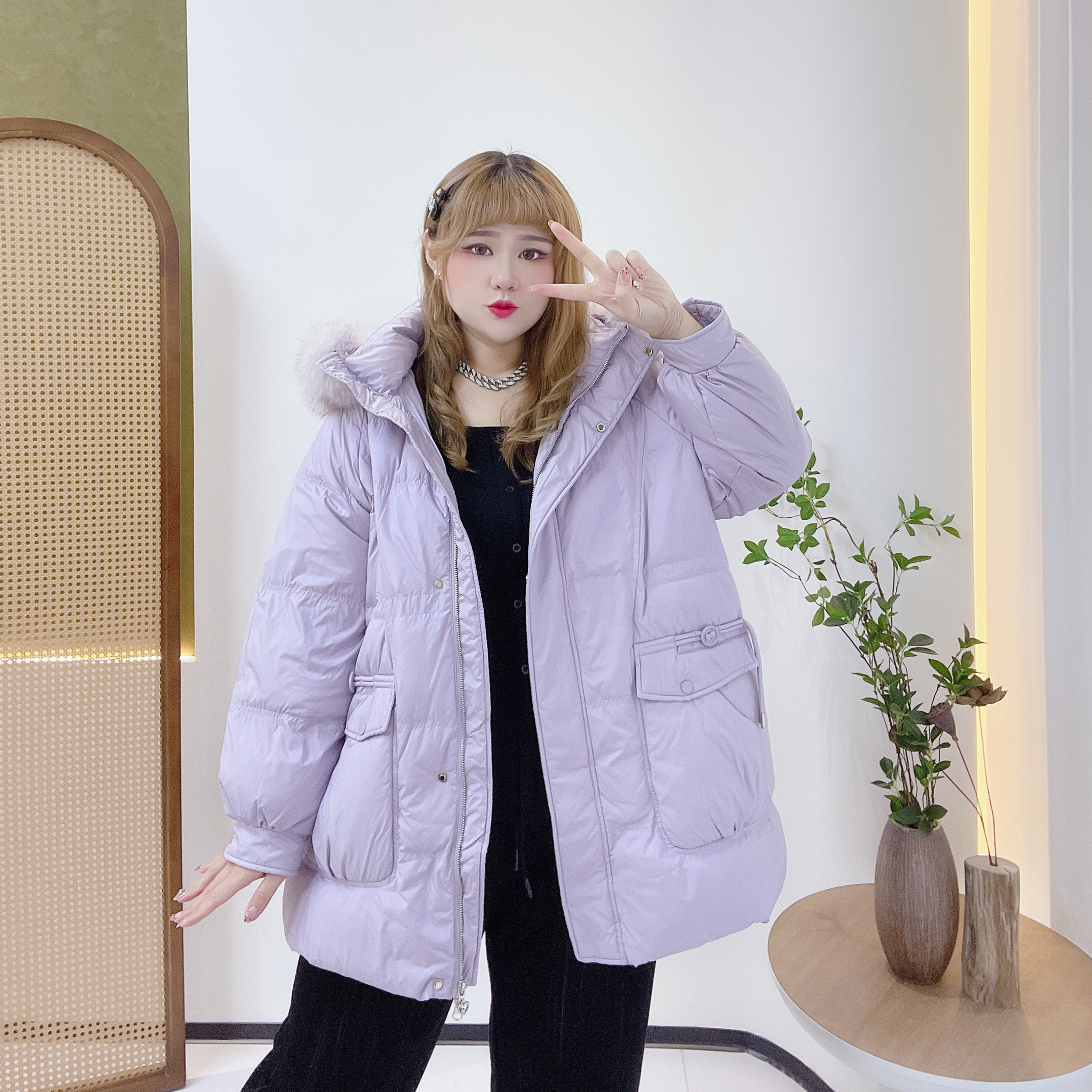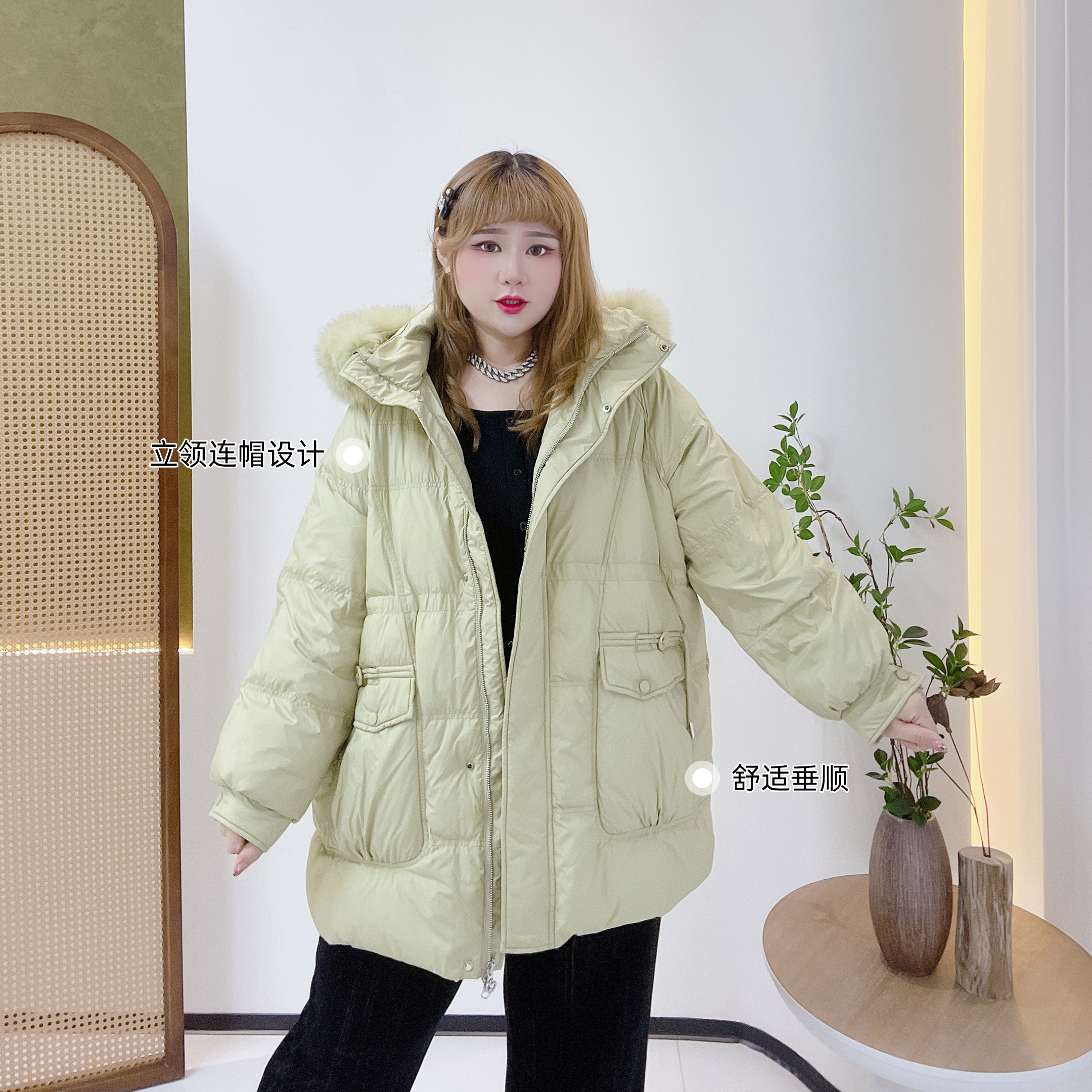 300斤胖莹莹大码女装大毛领时尚宽松加厚中长款连帽羽绒服外套