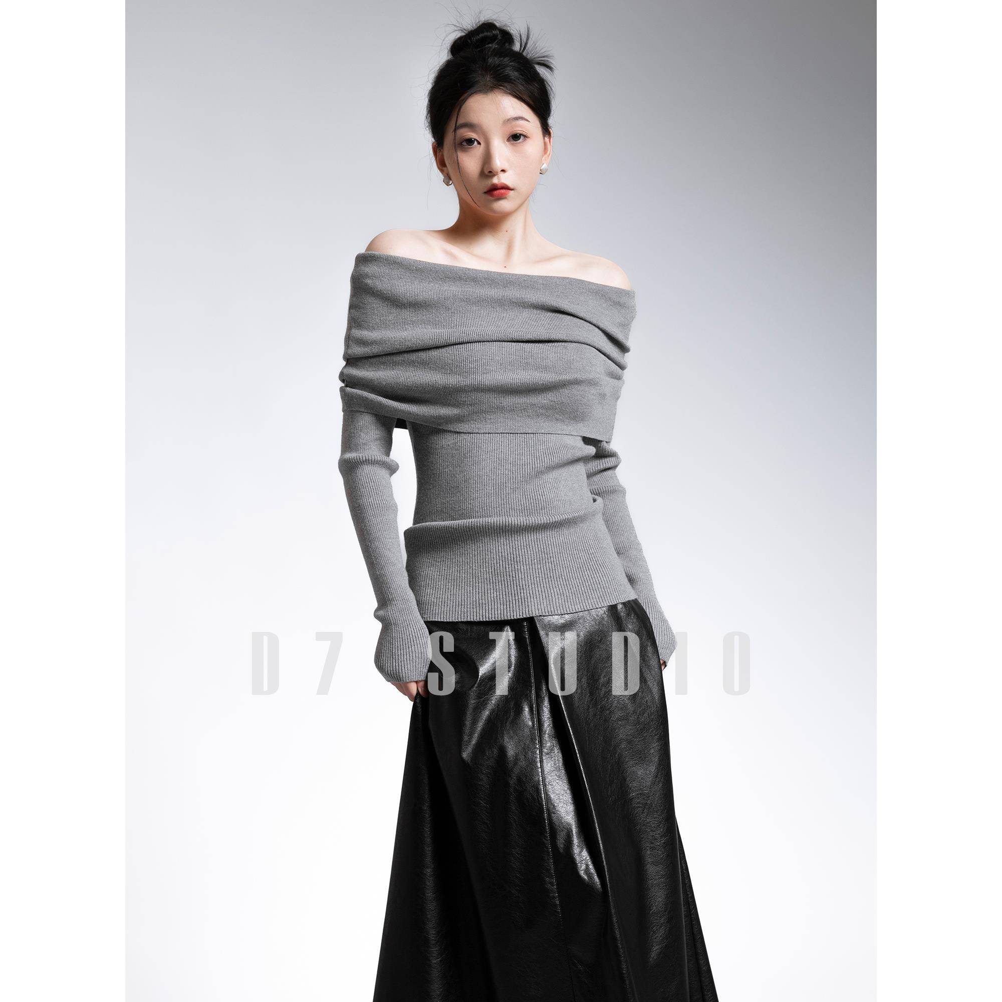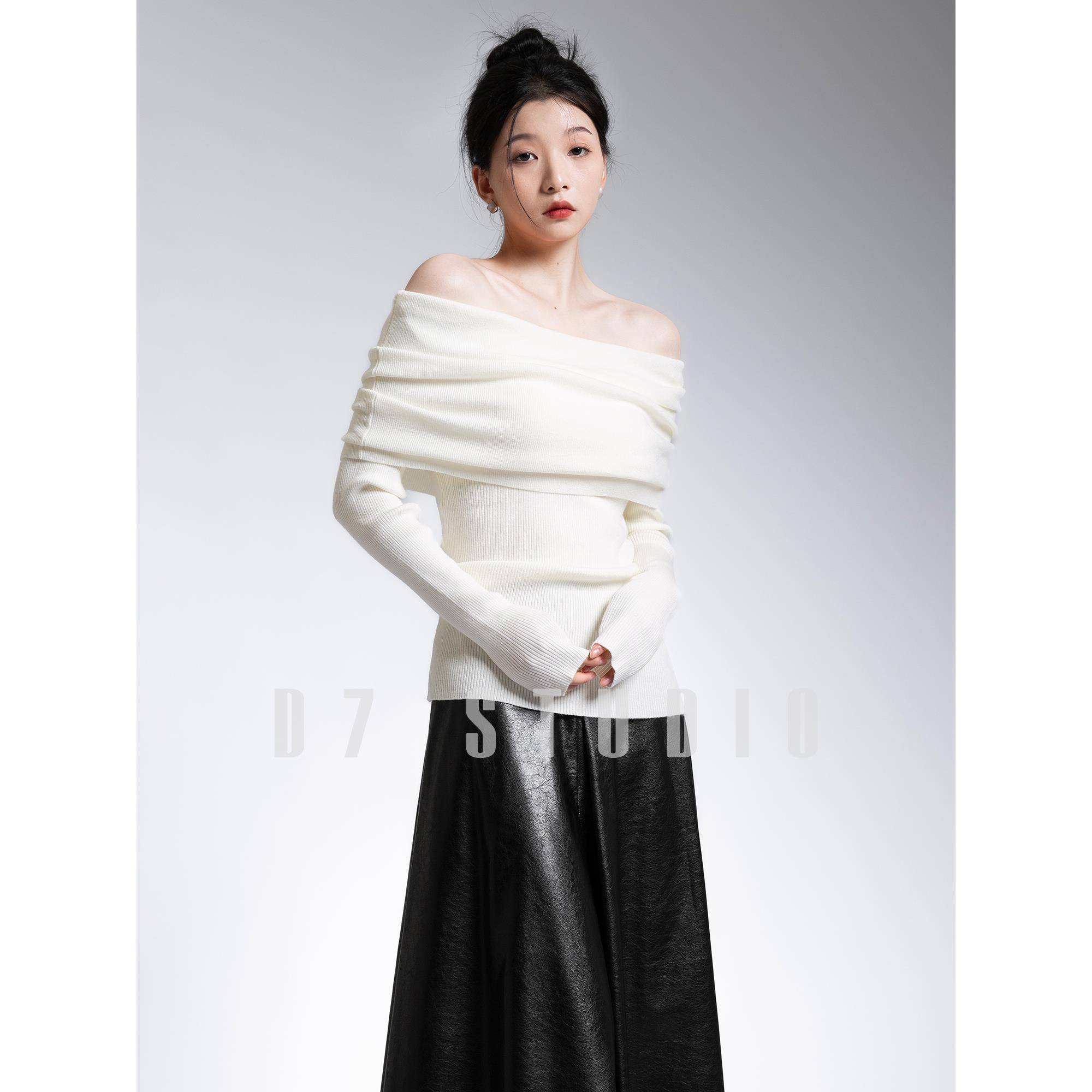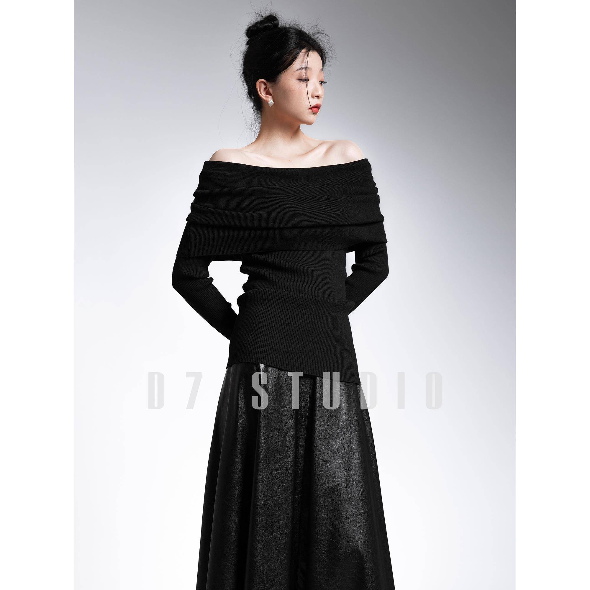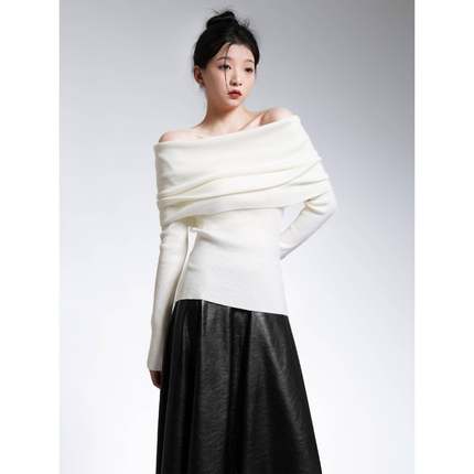 法式一字肩堆堆领针织衫女露肩修身外穿上衣打底衫春秋高级感毛衣