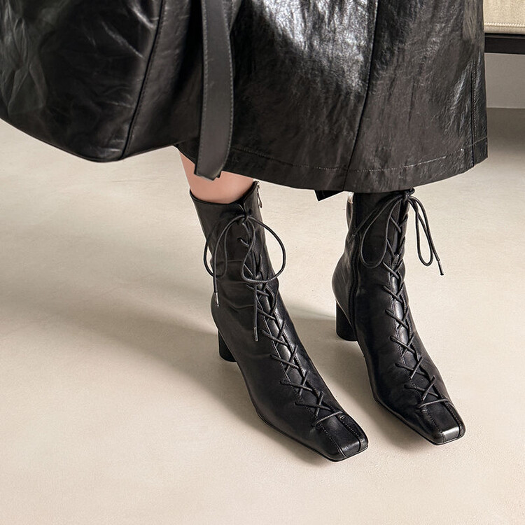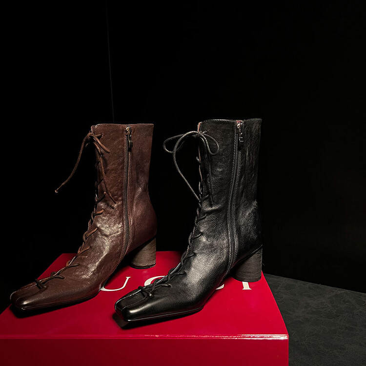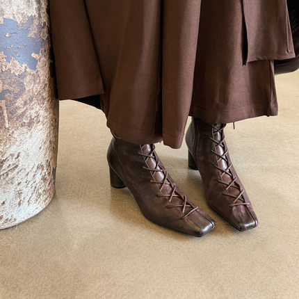复古风短靴女2024秋冬新款交叉绑带方头粗跟羊皮时装鞋真皮靴