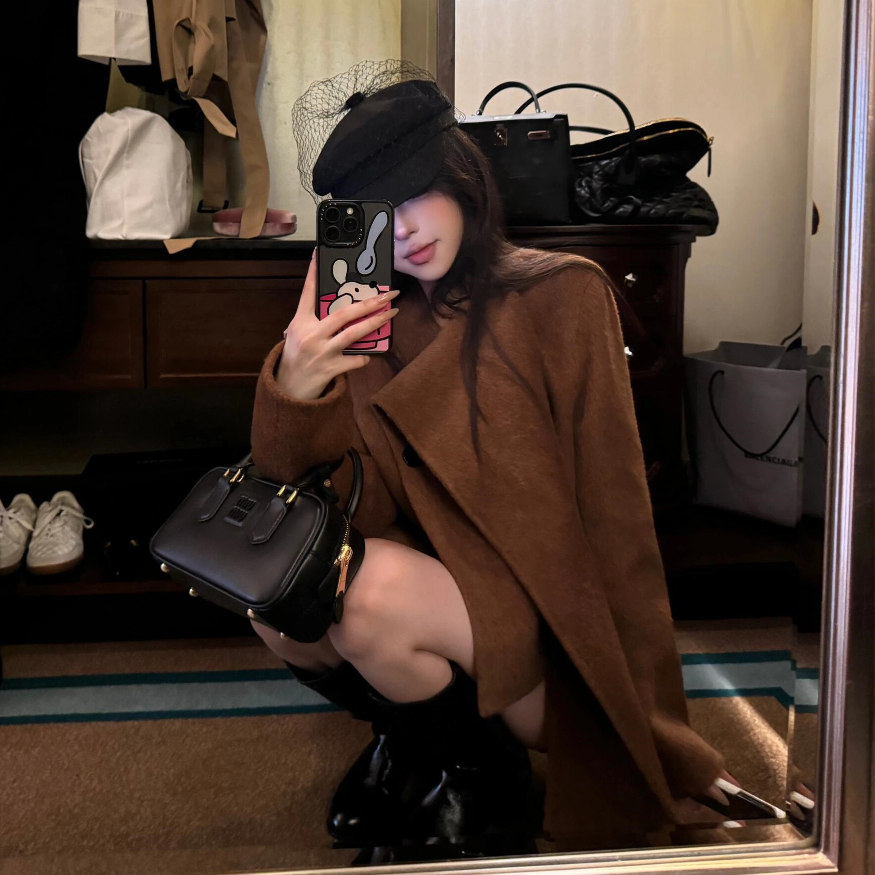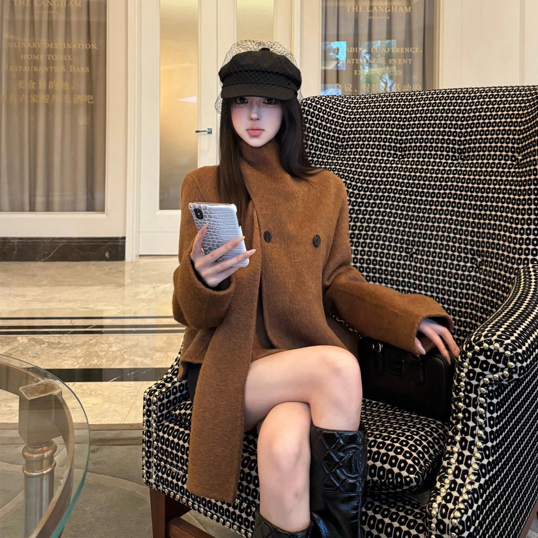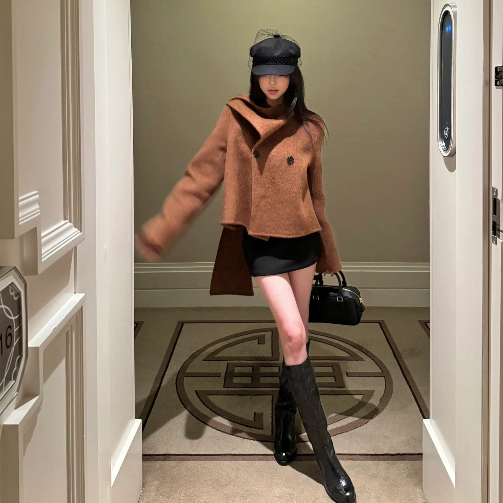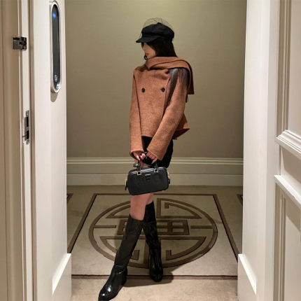 复古高级感围巾一体毛呢外套大衣