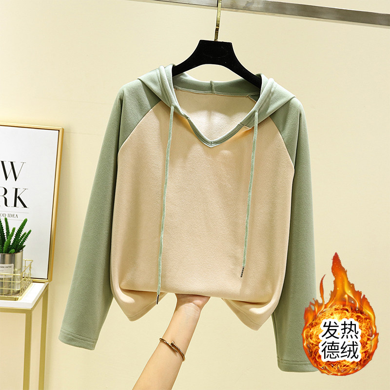 德绒插肩帽衫女冬时尚百搭连帽卫衣加绒长袖上衣加厚内搭保暖T恤