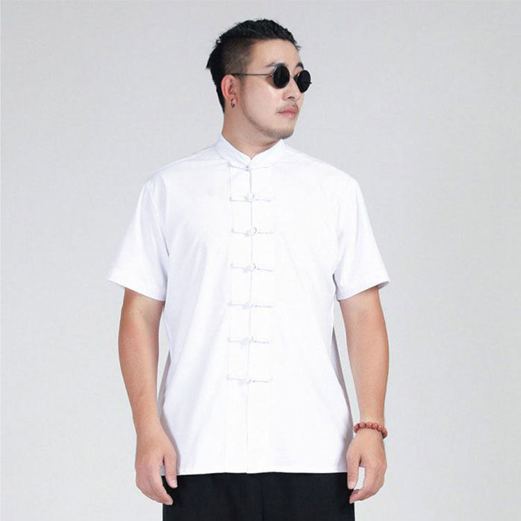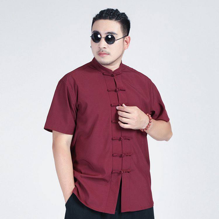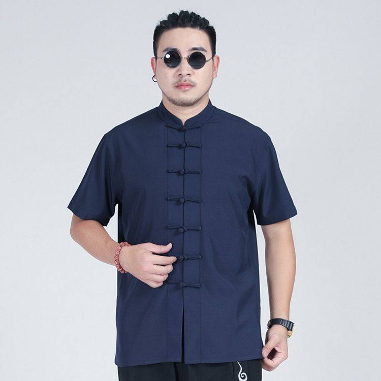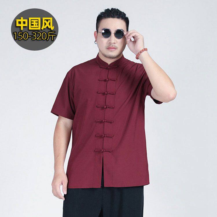 中式特大码盘扣短袖衬衫男立领汉服国风唐装肥佬加肥加大禅修衬衣