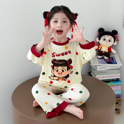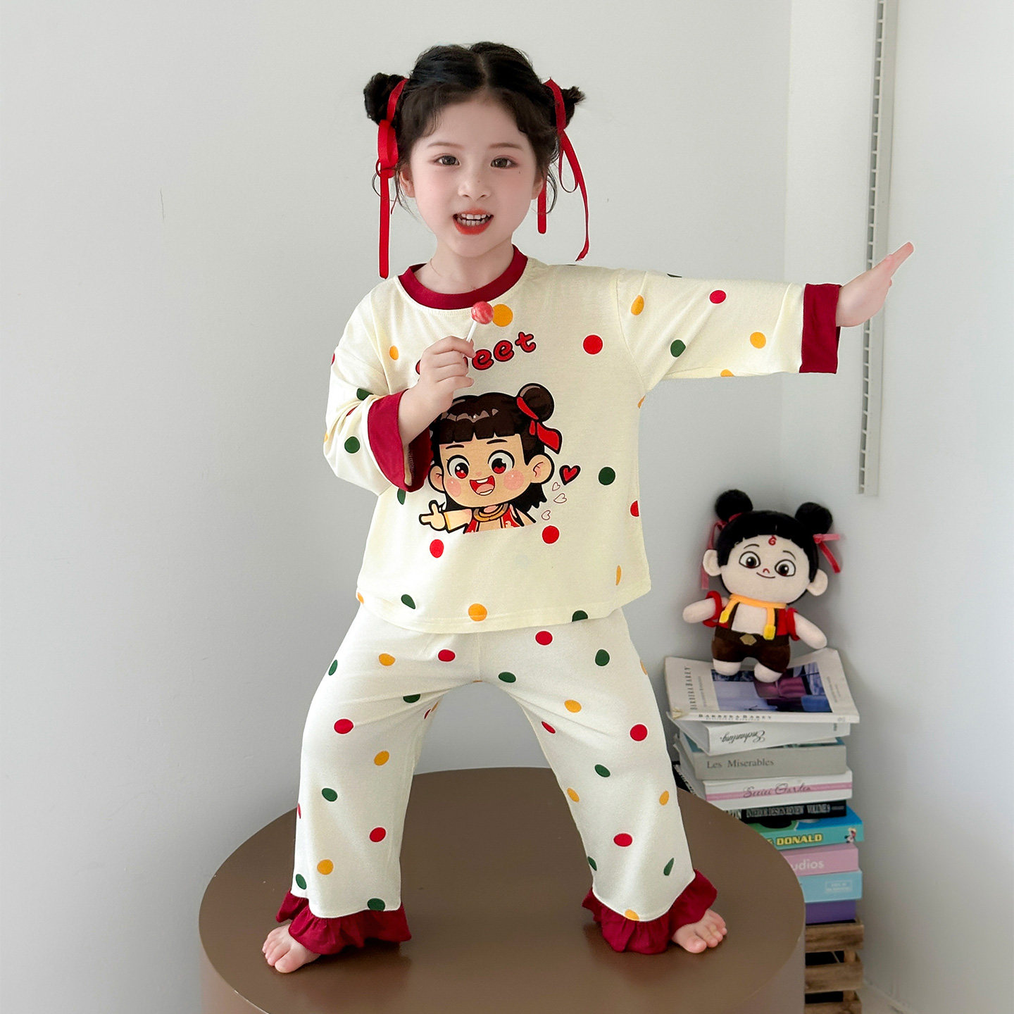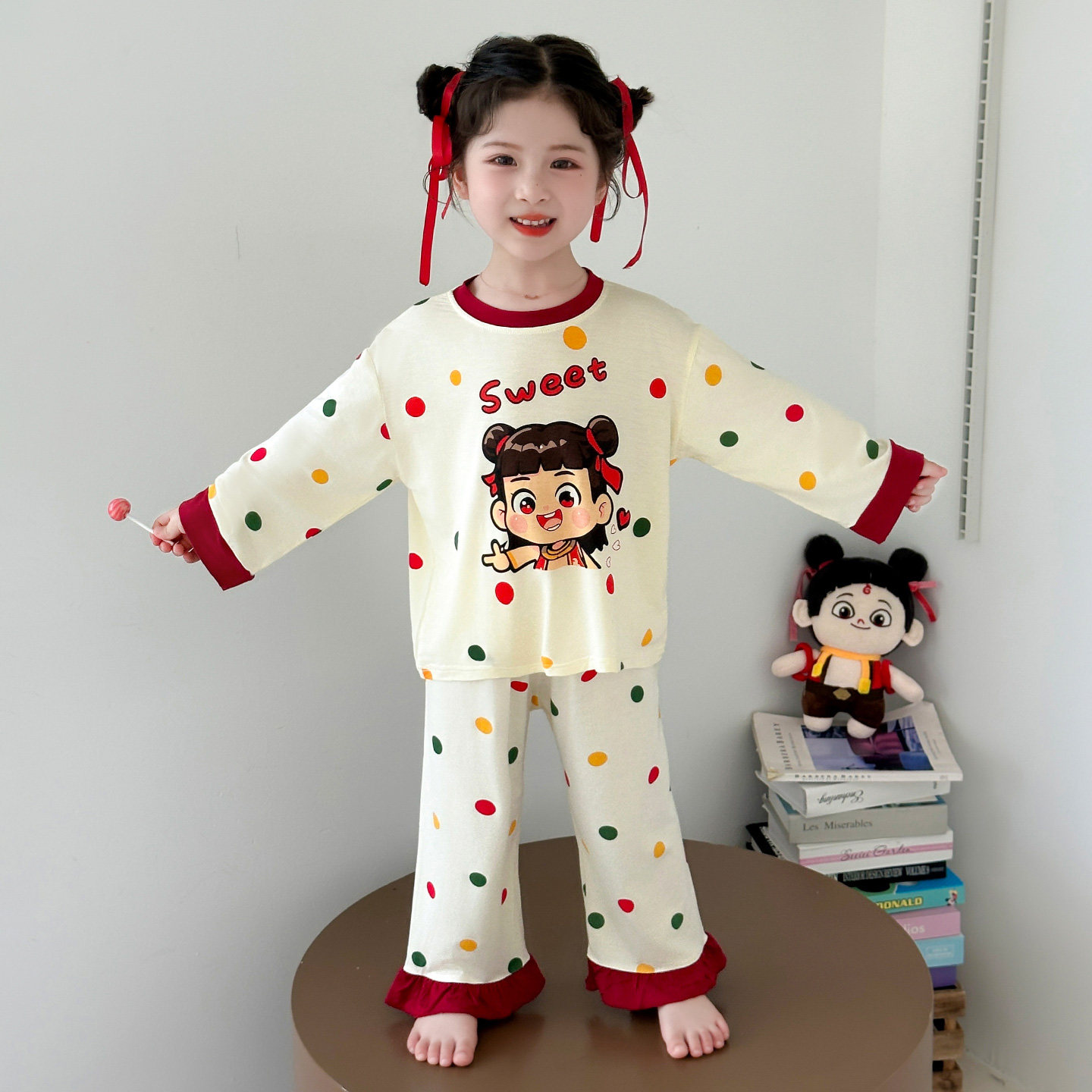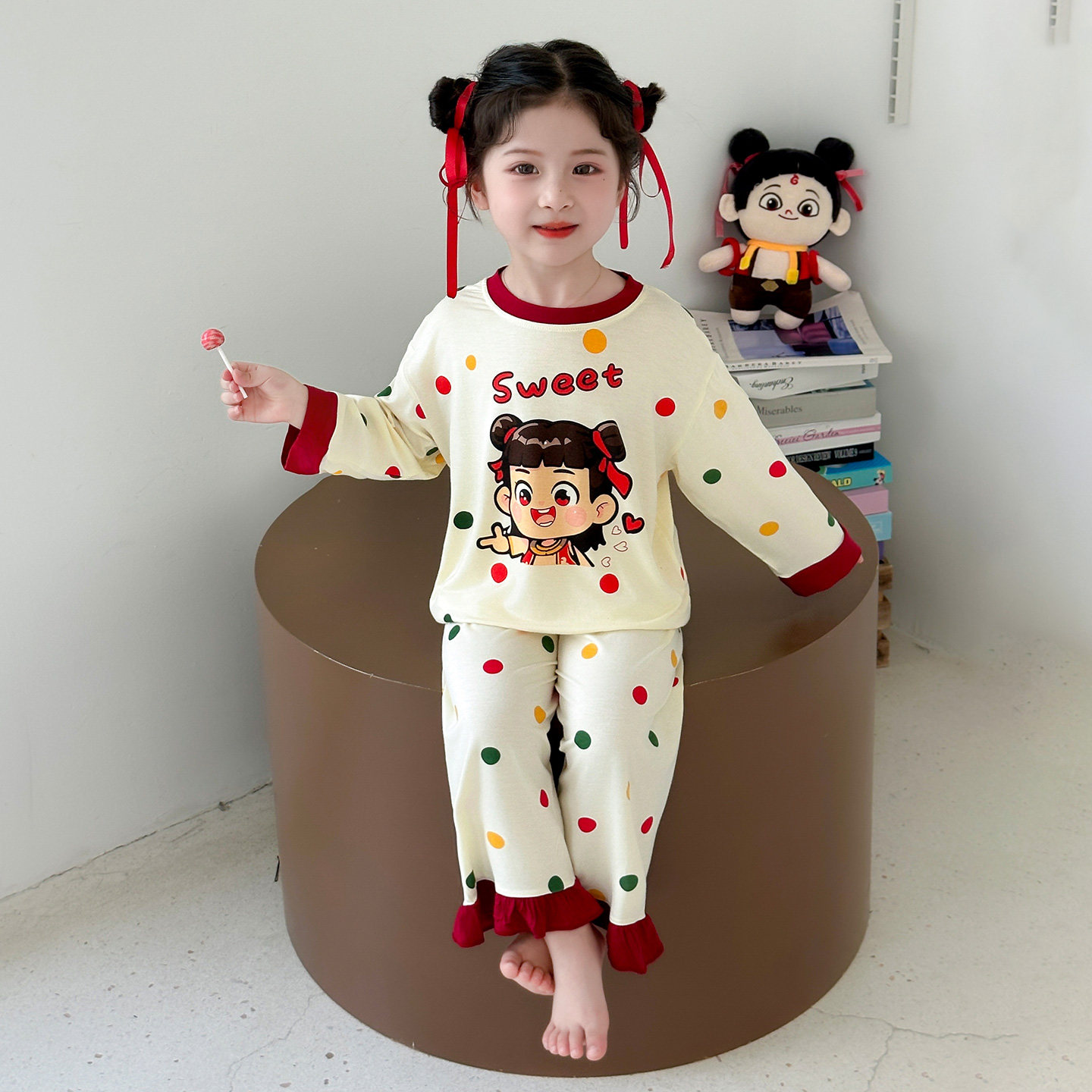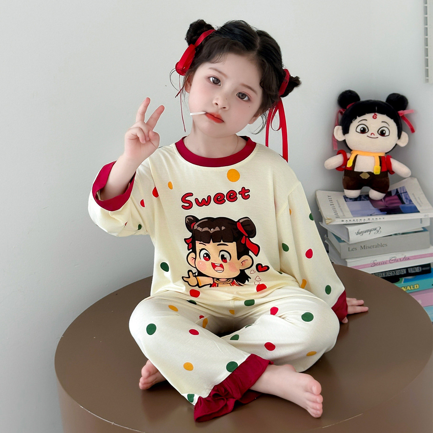 女童睡衣套装春夏莫代尔长袖长裤花边圆点哪吒可爱家居服中小童款