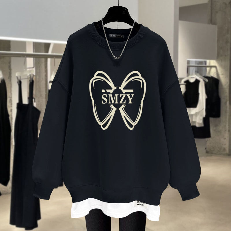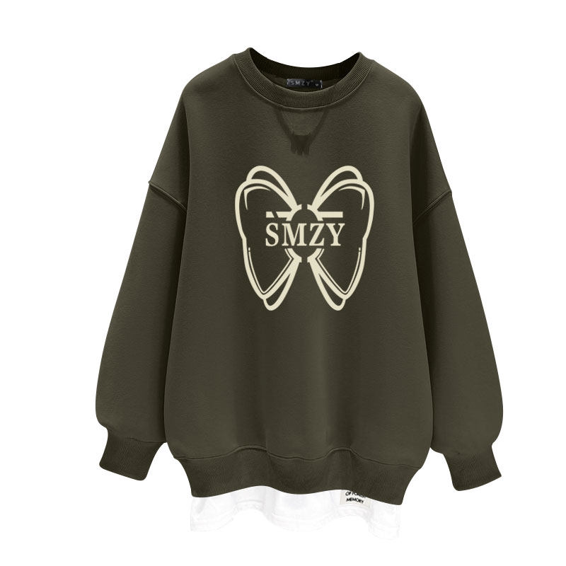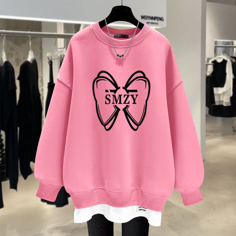 加绒宽松假两件蝴蝶结圆领卫衣女