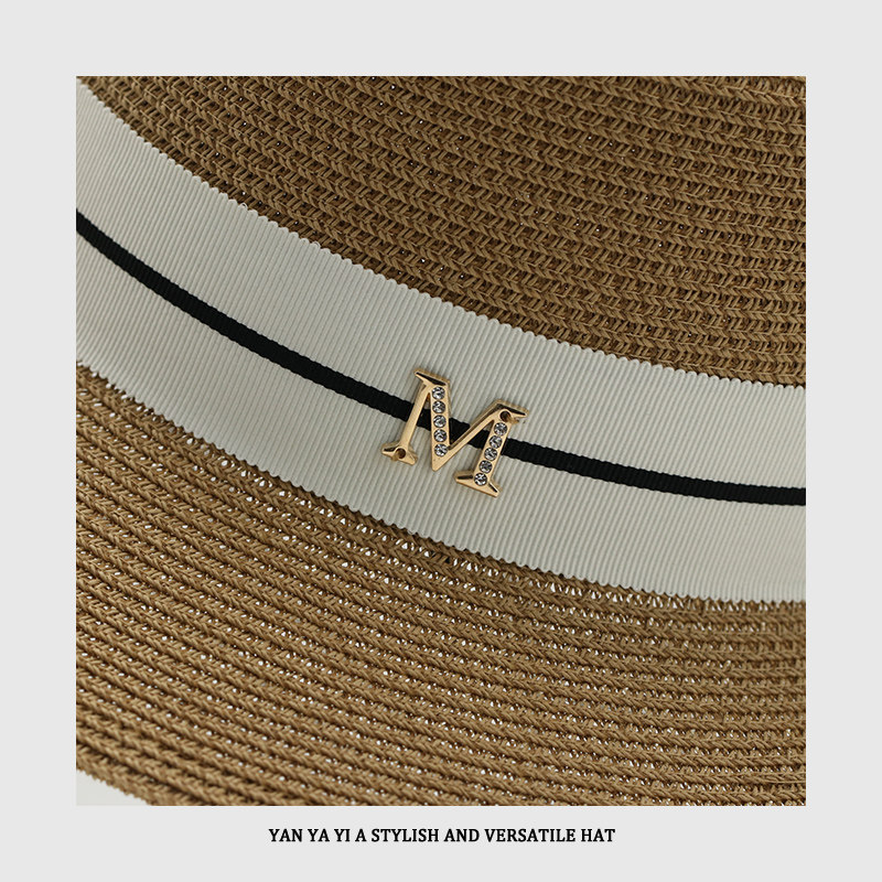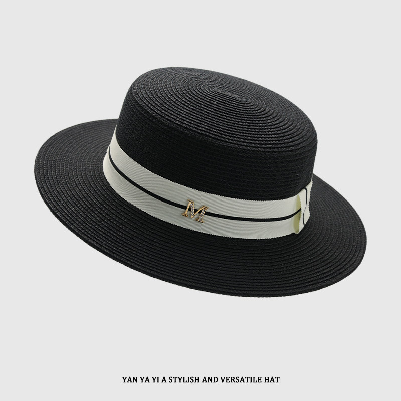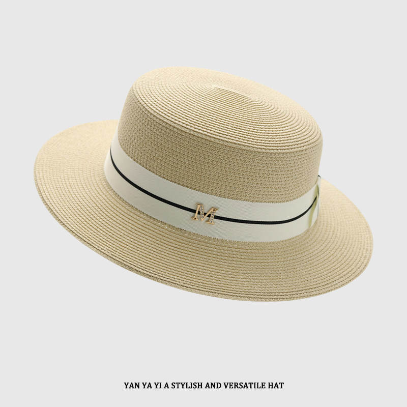 刘亦菲同款M标平顶草帽夏季复古百搭海边遮阳防晒太阳沙滩帽子女