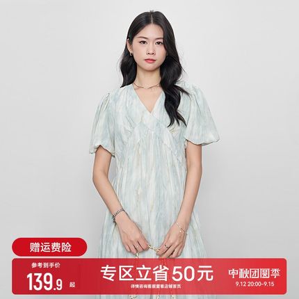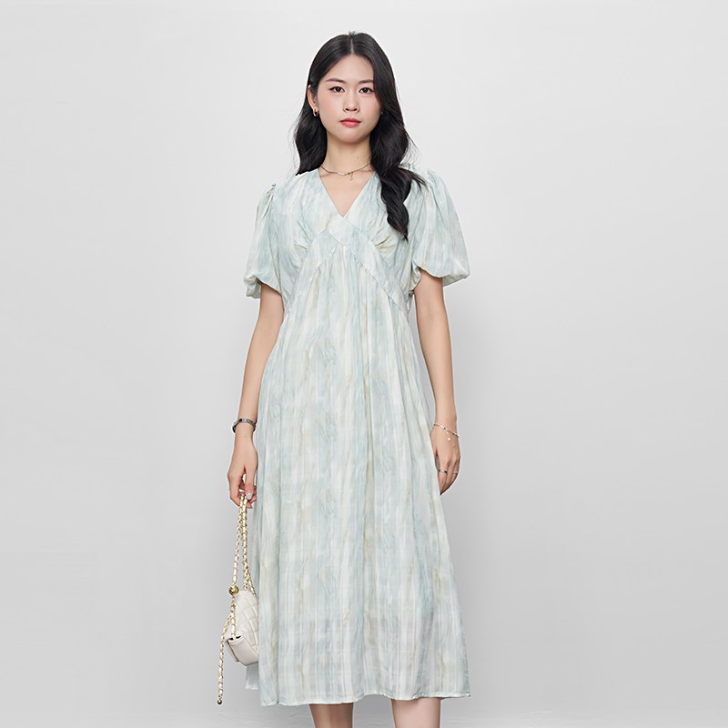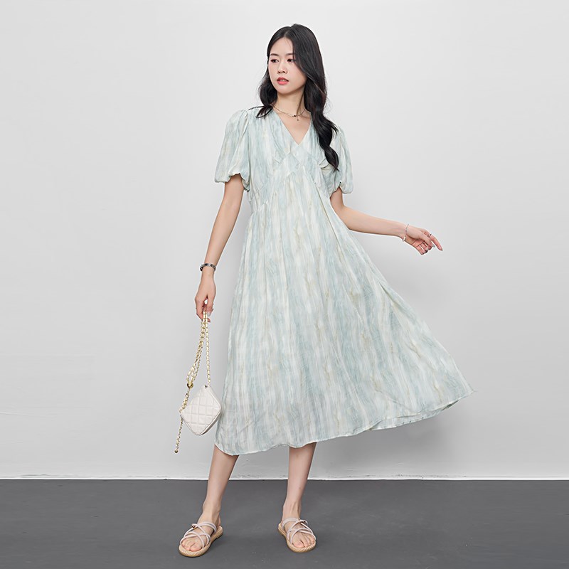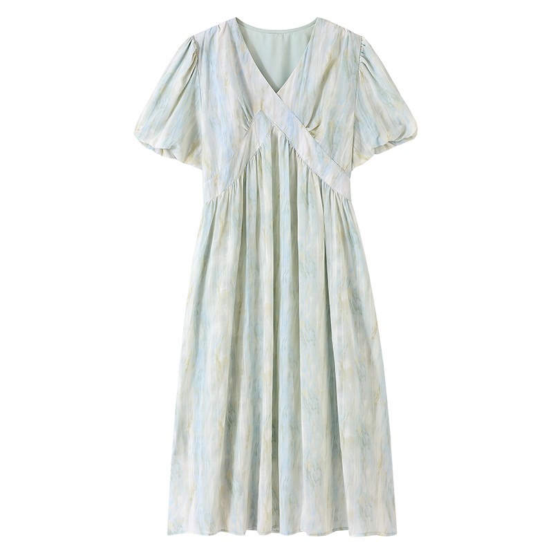 孕妇装2024新款法式Vr领连衣裙高级感泡泡袖A字裙小个子中长款裙