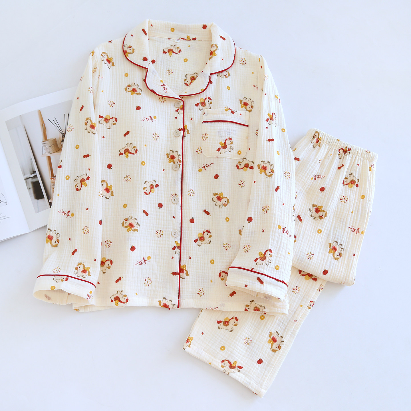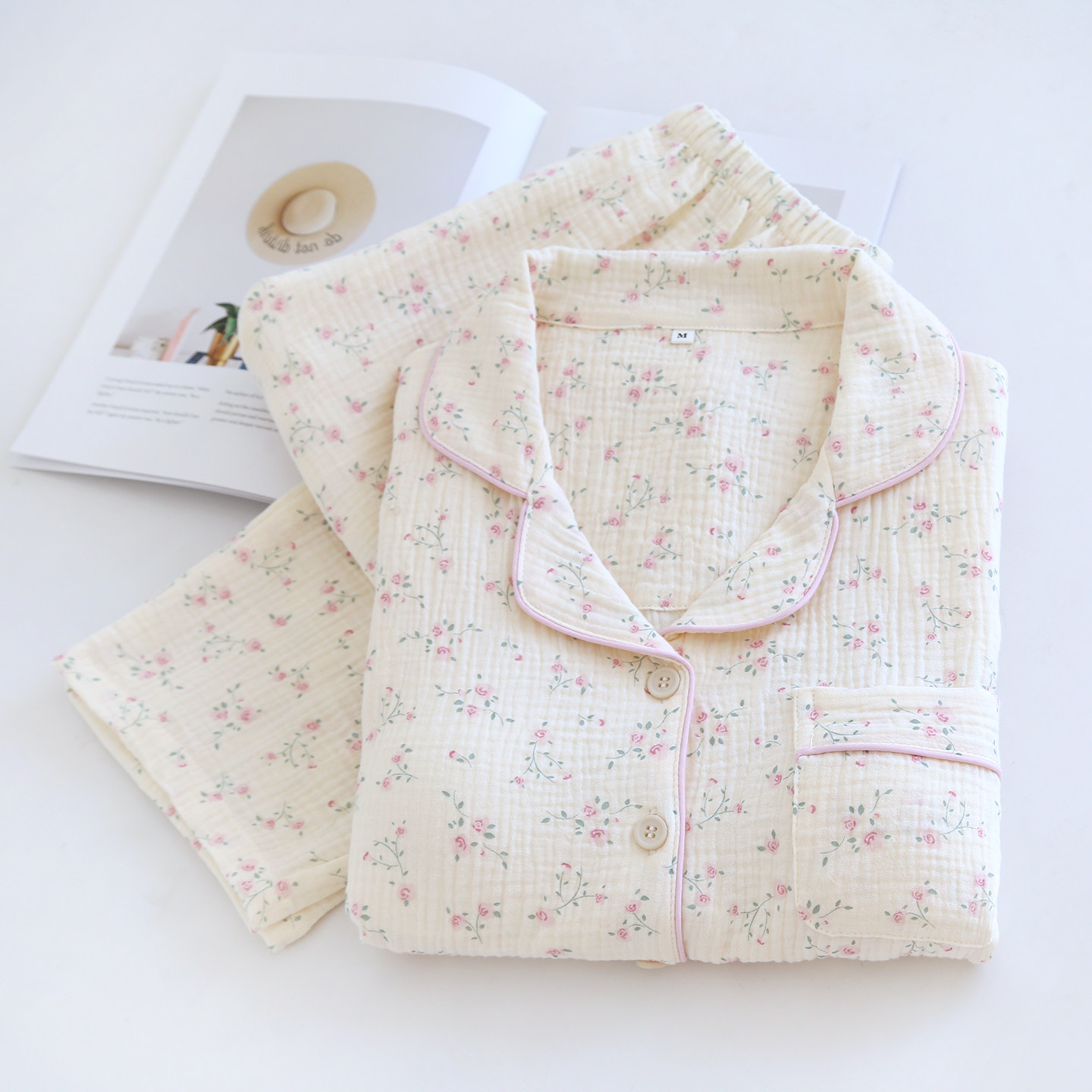 春夏薄款女士纯棉绉布胸垫睡衣免穿文胸双层纱布家居服套装卡通
