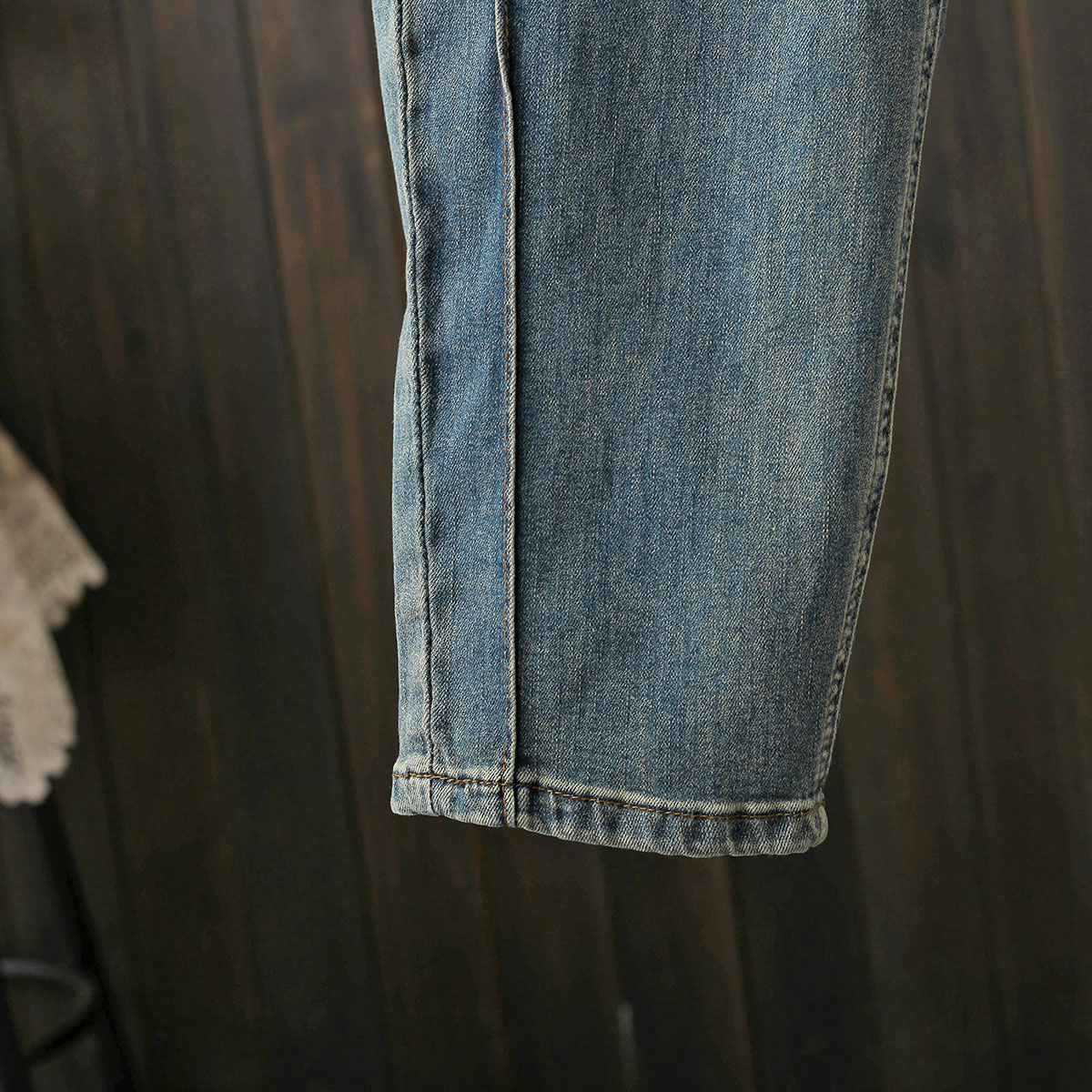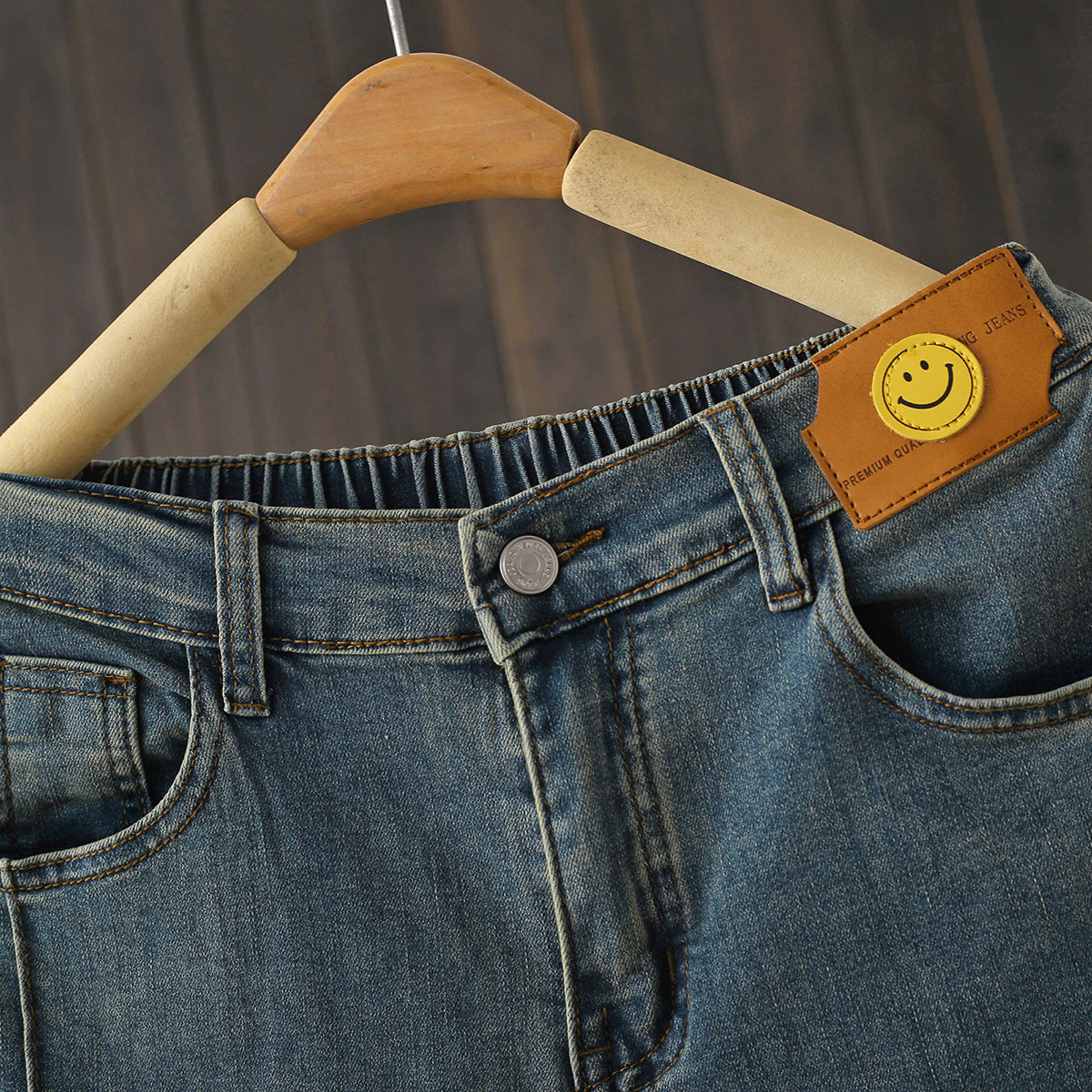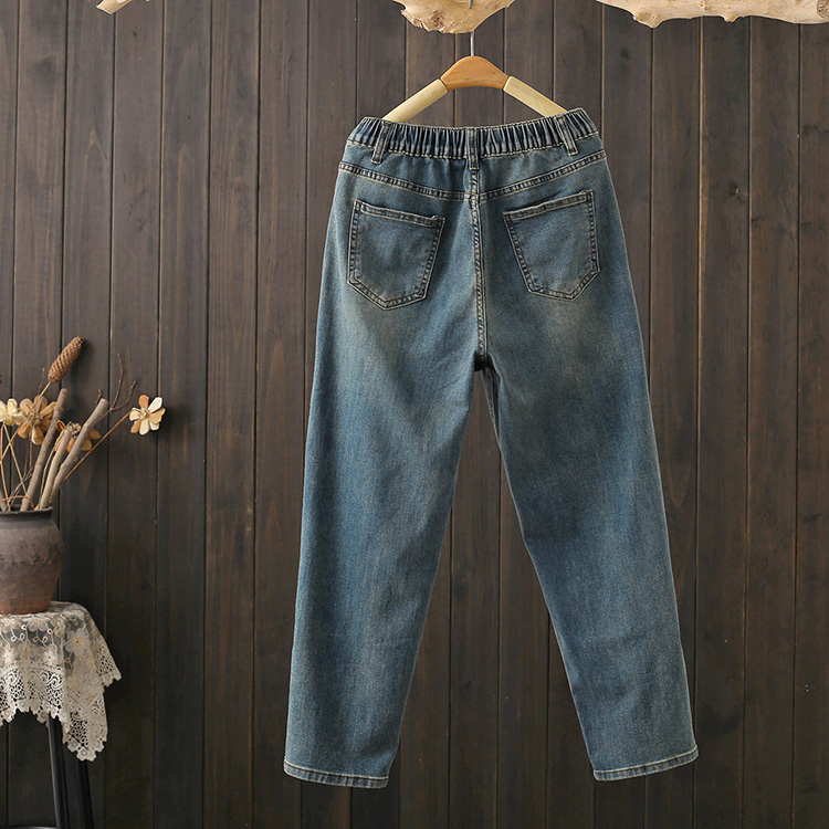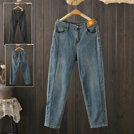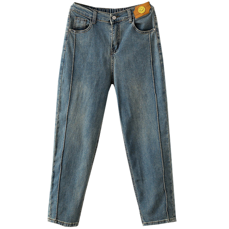 春秋大码200斤梨型身材牛仔裤笑脸贴标老爹裤胖mm宽松显瘦哈伦裤