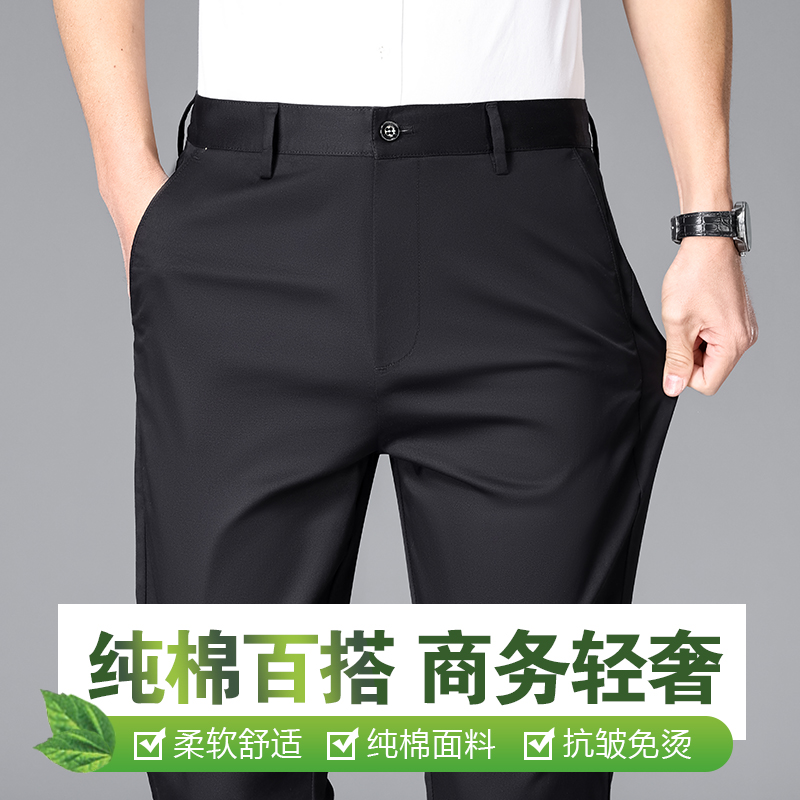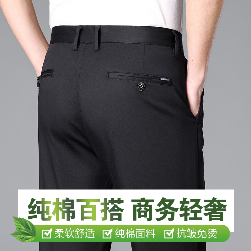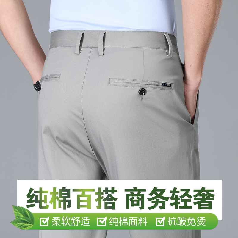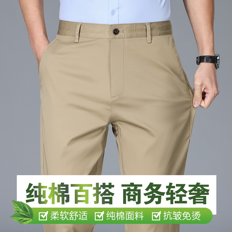袋鼠卡其色纯棉高端休闲裤男士直筒宽松西裤上班裤子夏季薄款冰丝