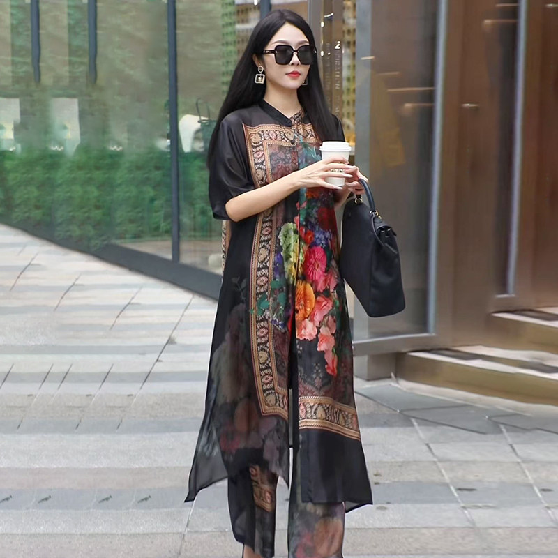 复古大码田园风印花飘逸开衫宽松阔腿裤富太太优雅时尚两件套装女