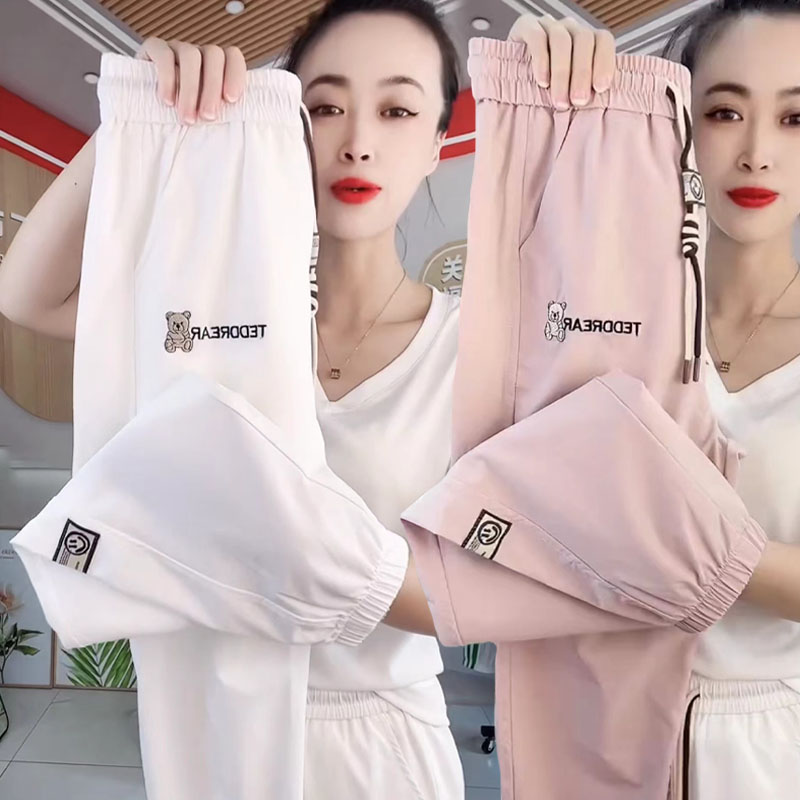 冰丝速干运动裤女士夏季薄款透气百搭高腰束脚刺绣显瘦九分休闲裤