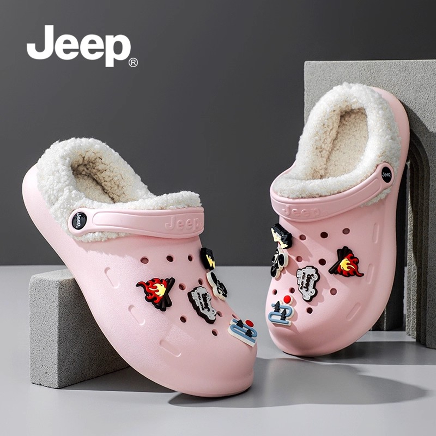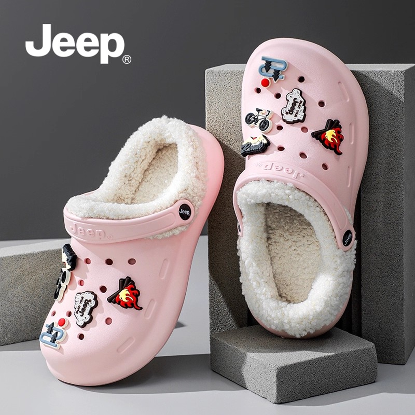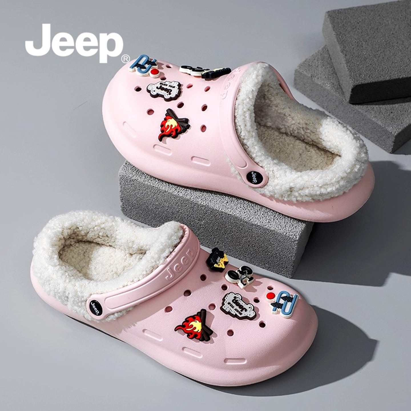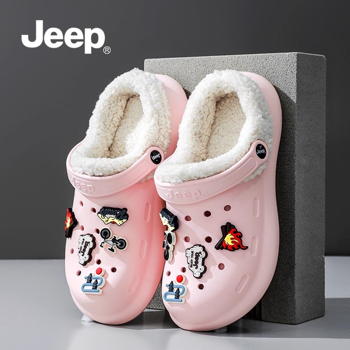 JEEP加绒洞洞鞋女款冬季外穿棉拖2025新款加棉毛毛棉鞋女冬棉拖鞋