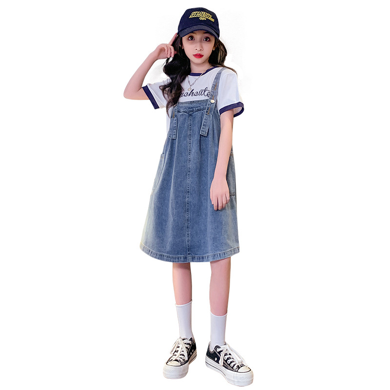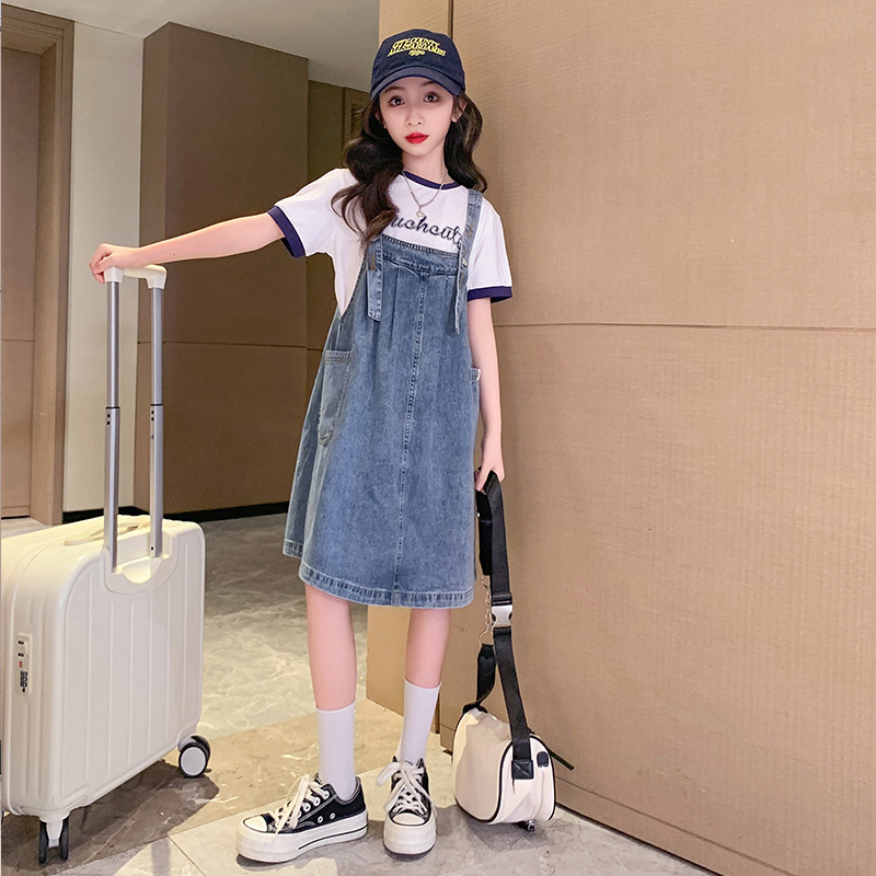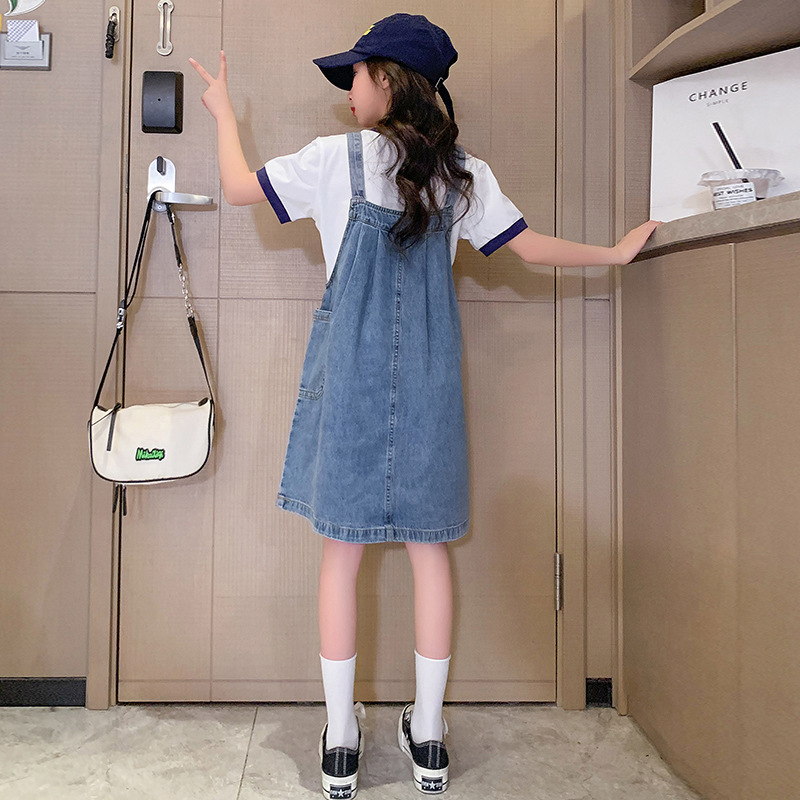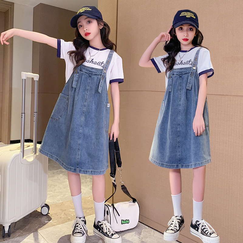 胖女童牛仔背带裙套装胖妞女孩夏裙宽松裙子夏季女大童吊带连衣裙