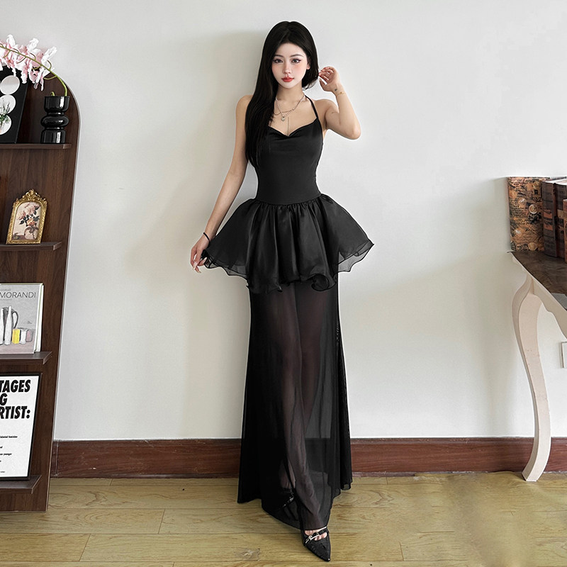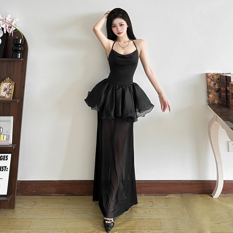 SylCue 暗黑系性感小魔女设计感假两件挂脖吊带连衣裙网纱长裙夏