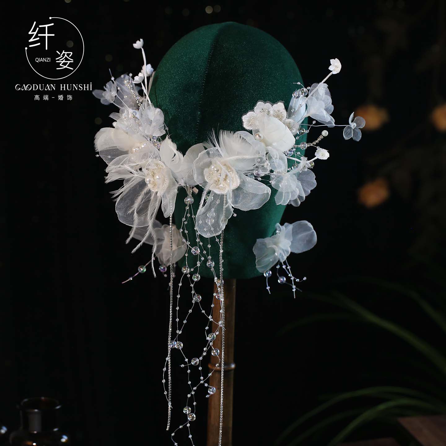 新款森系白纱仙气浪漫流苏精致羽毛手工头花新娘婚纱礼服头饰配饰