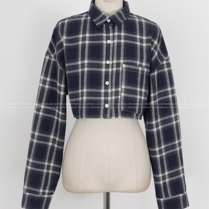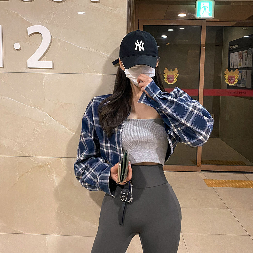 韩国东大门2021年春防晒纯棉短款格子衬衫春秋新款女高腰洋气衬衣