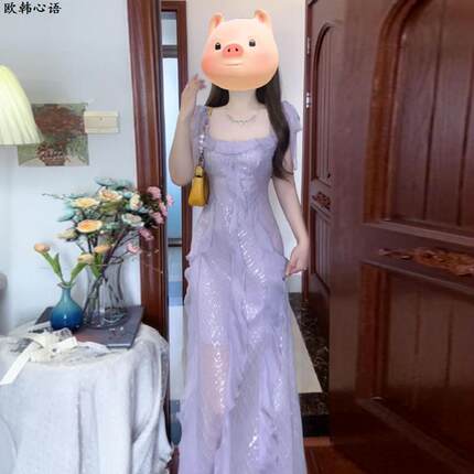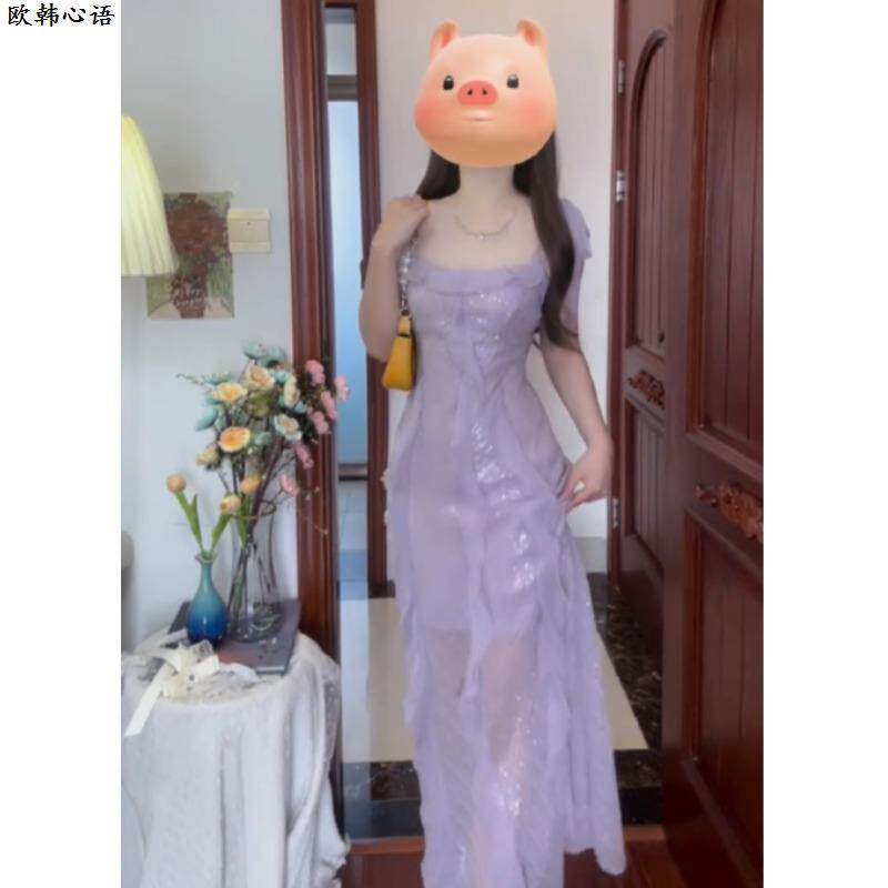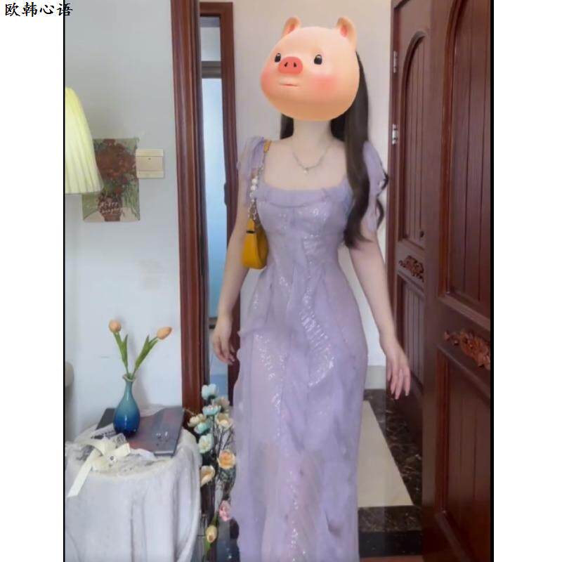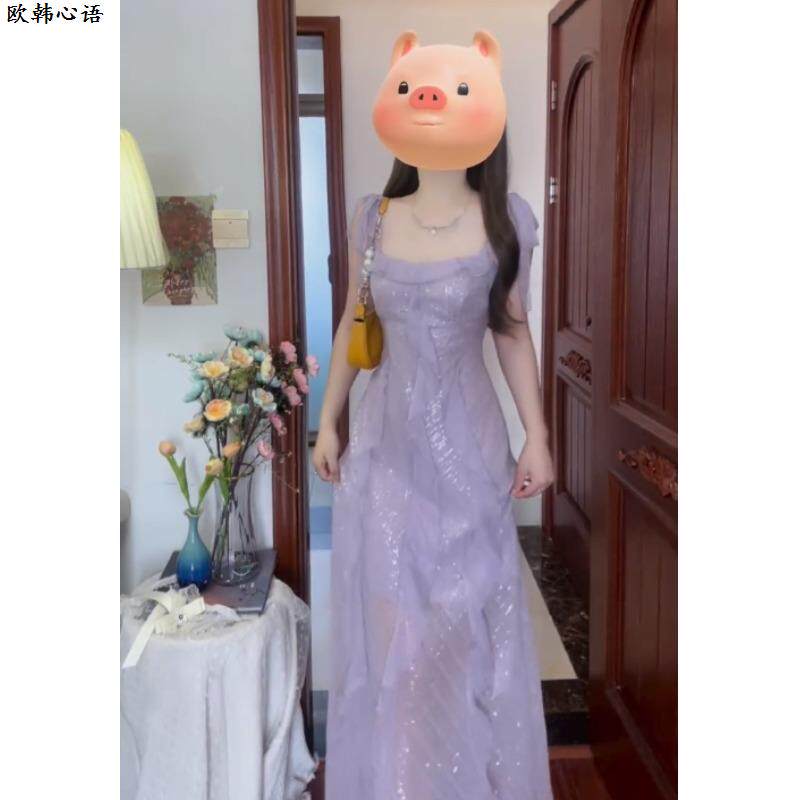 高端精致紫色亮片宴会礼服裙女夏新款法式气质名媛绝美收腰连衣裙