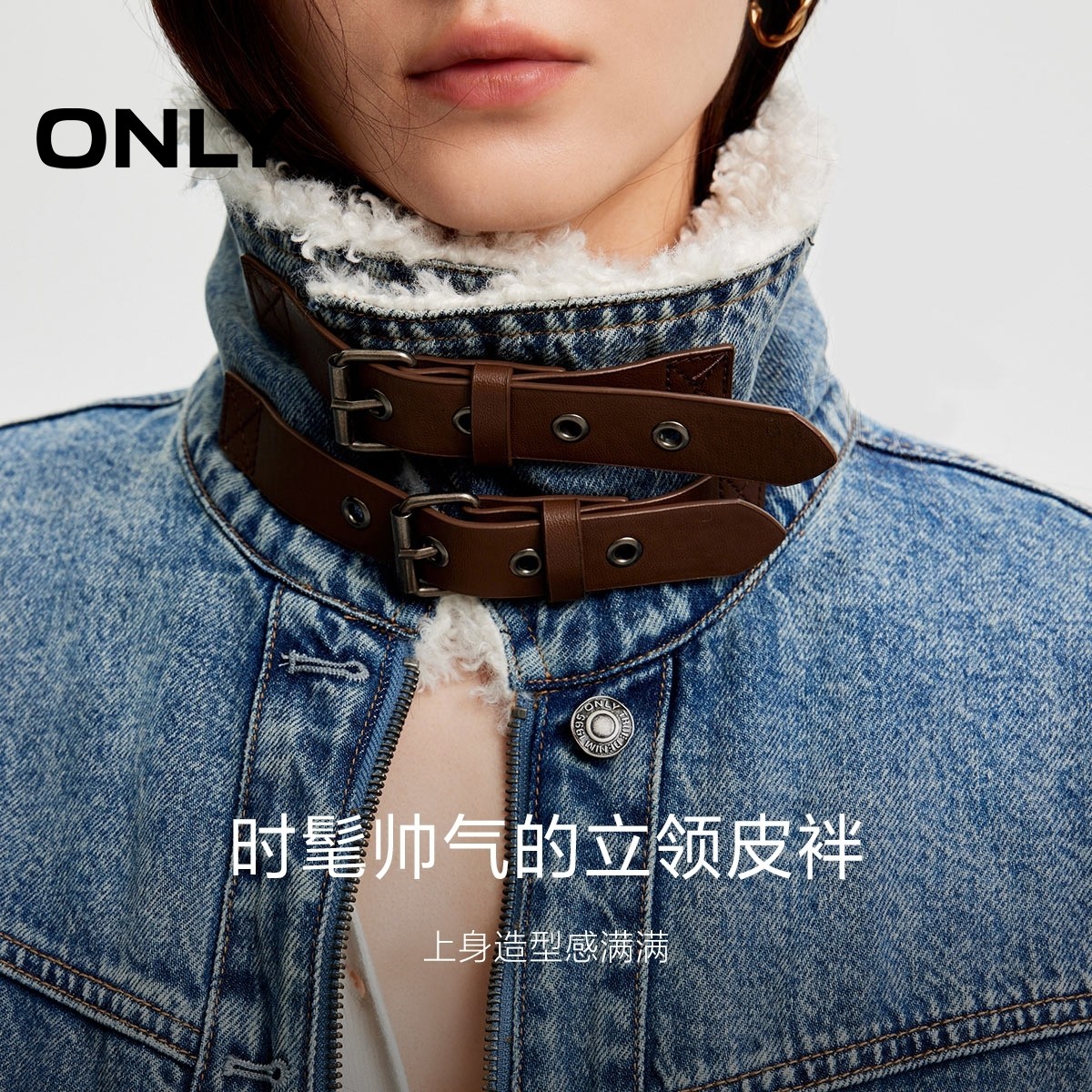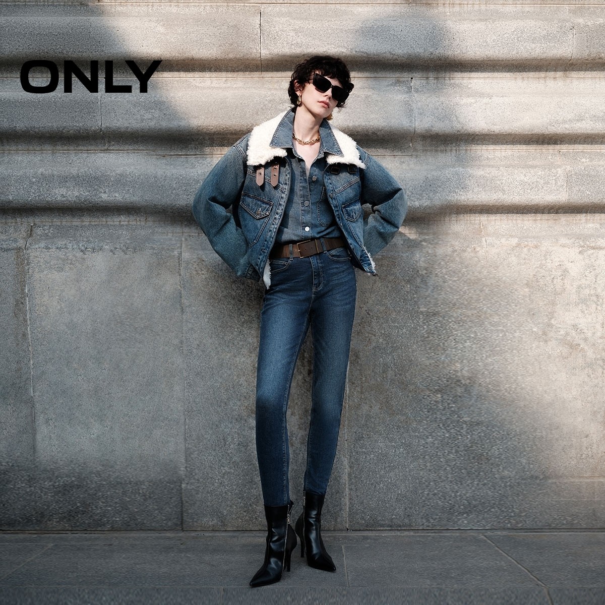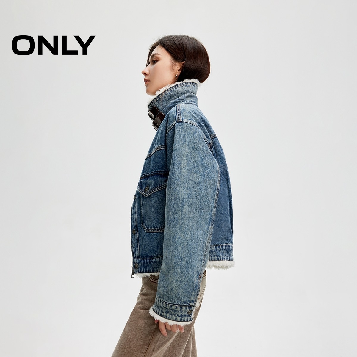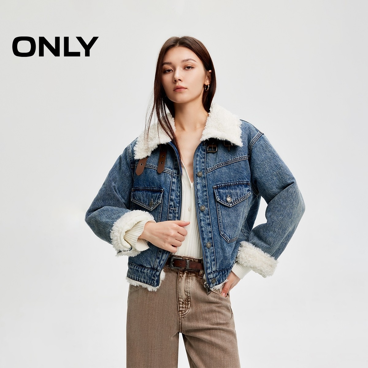 ONLY2025冬季新款复古帅气毛绒拼接领口保暖牛仔外套女
