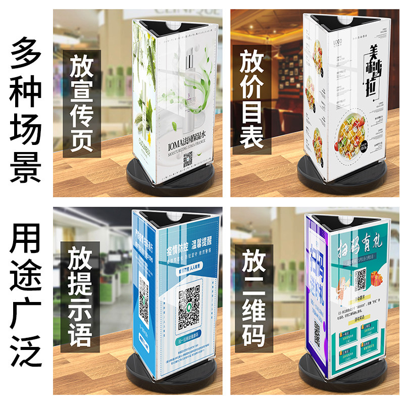 高品质亚克力三面旋转酒水牌 台卡架 台签 a4桌牌 5旋转餐牌菜单展示三角台牌桌面立牌台号卡价格标价牌桌签