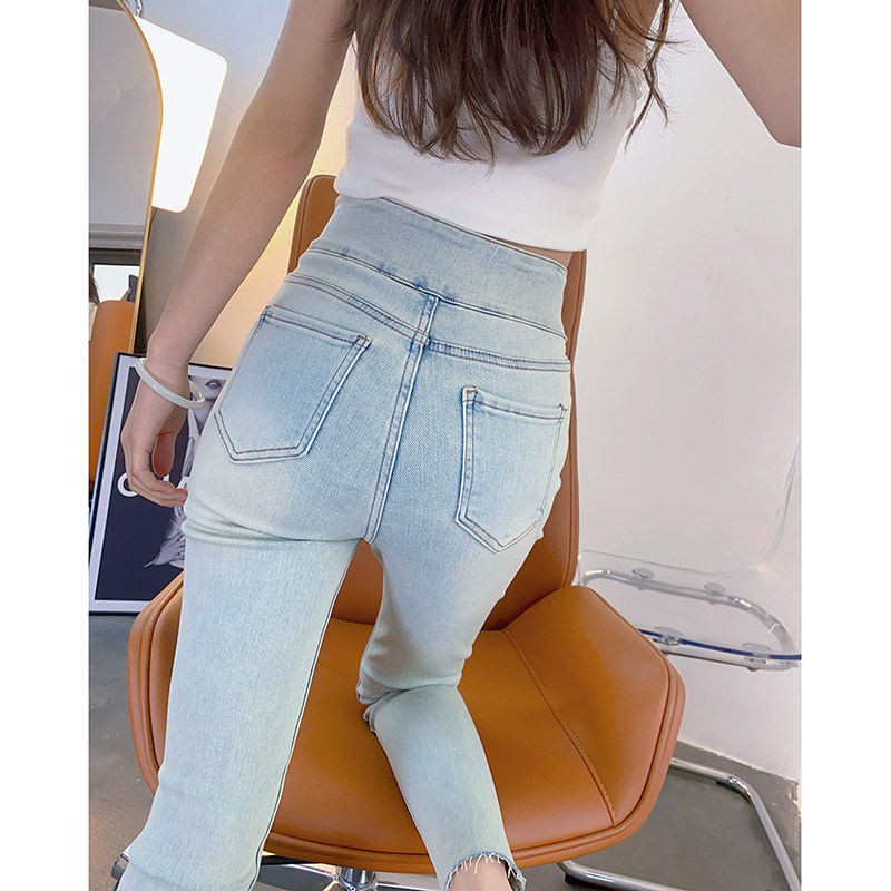 小众小清新蓝白色高腰三排扣牛仔裤女秋冬弹力紧身小脚铅笔裤潮款