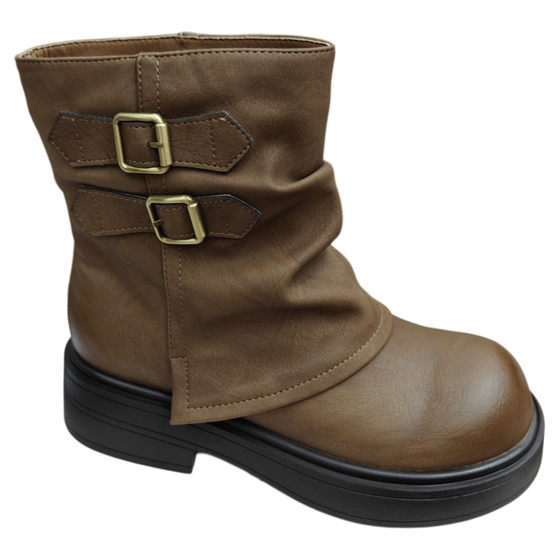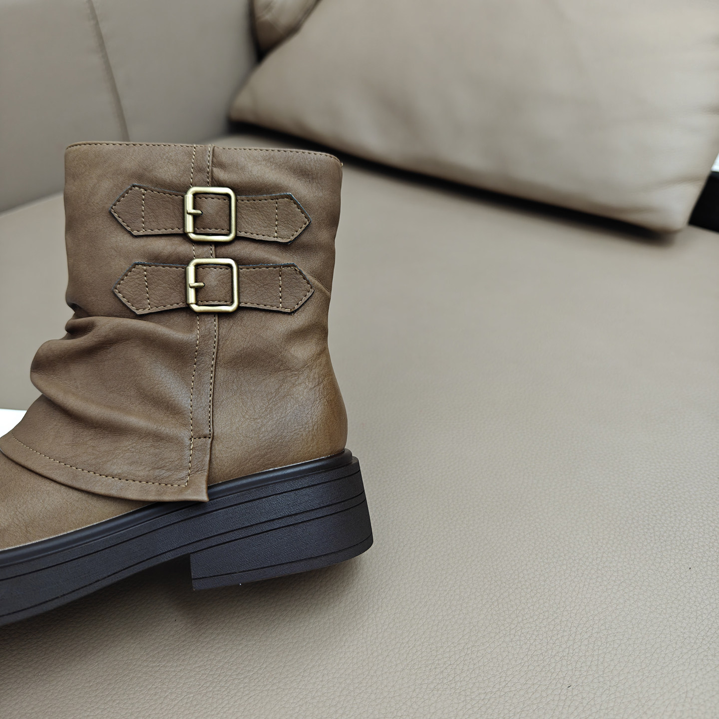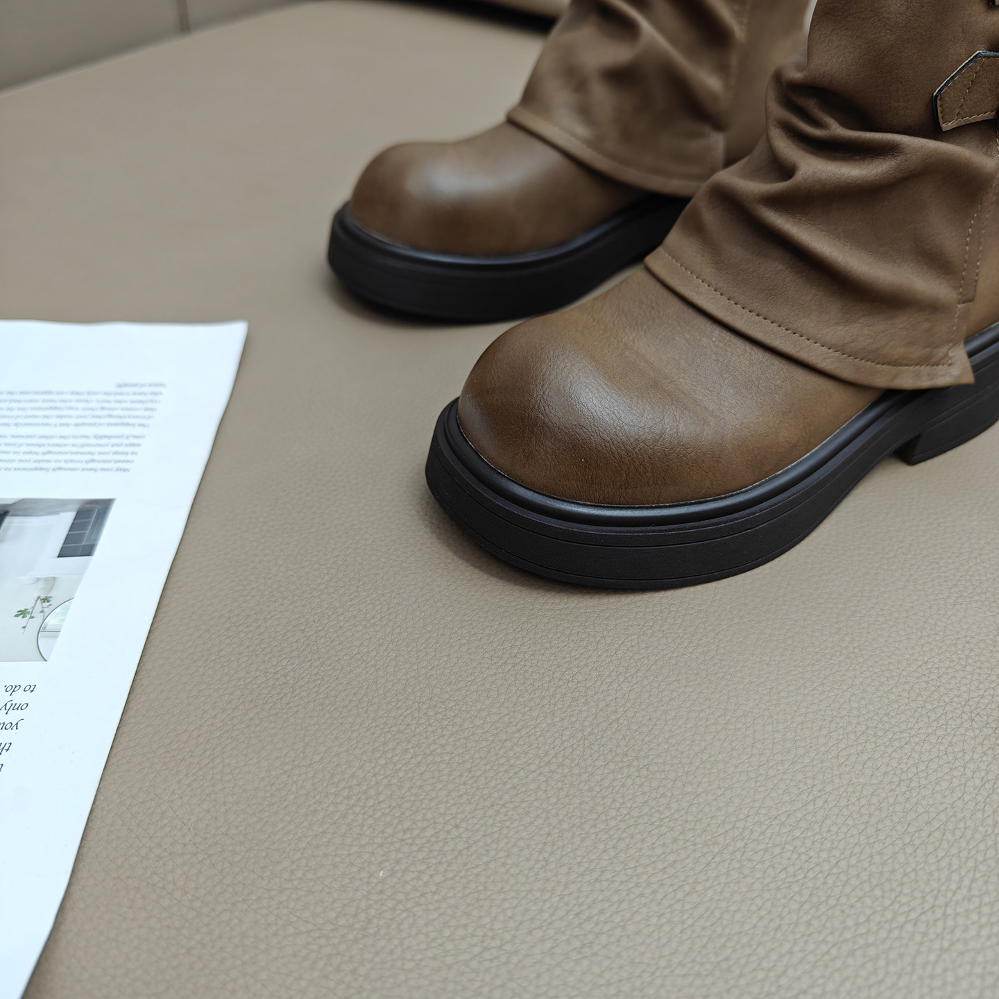 复古风时尚厚底西部牛仔靴女2025秋冬褶皱轻便套筒皮带扣马丁短靴