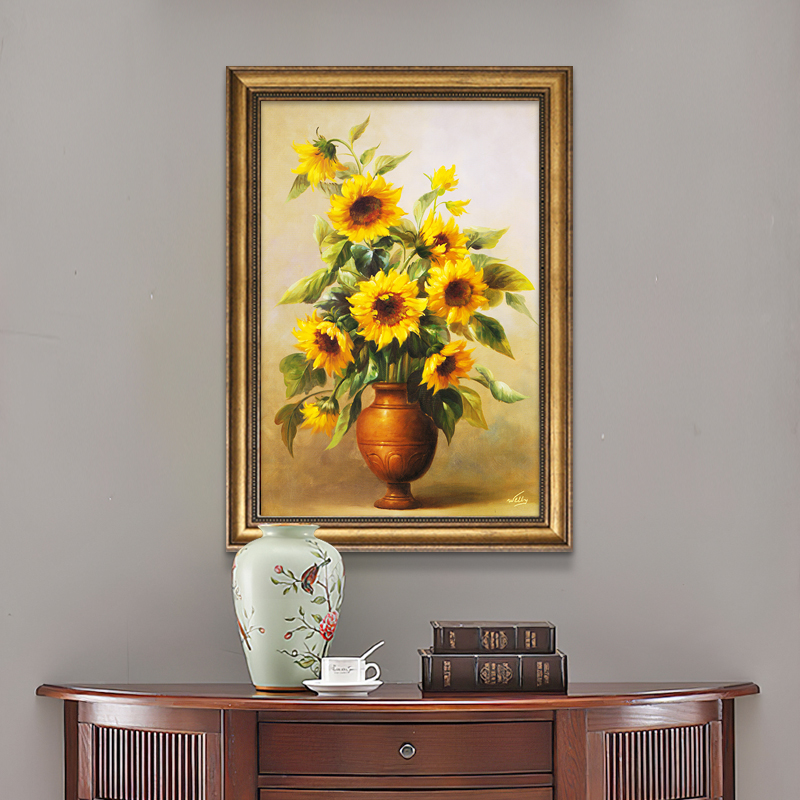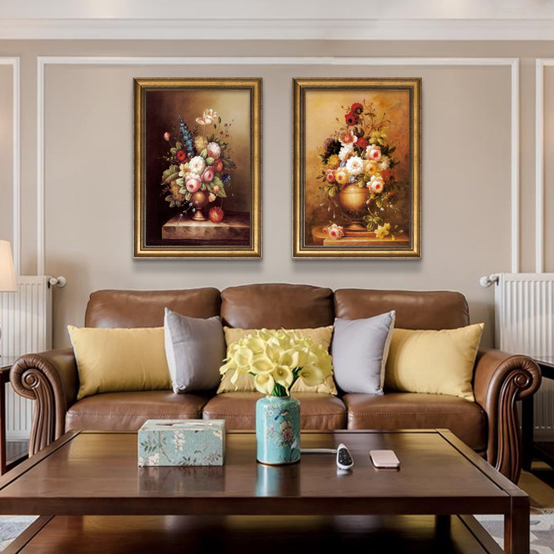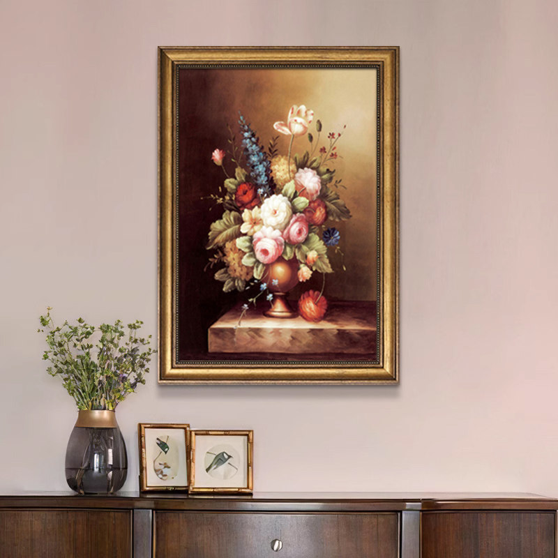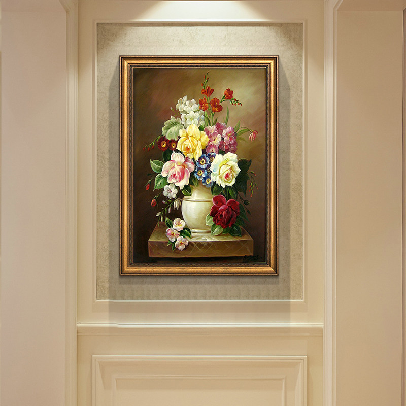 玄关装饰画牡丹花挂画美式欧式客厅餐厅复古手绘油画走廊过道壁画