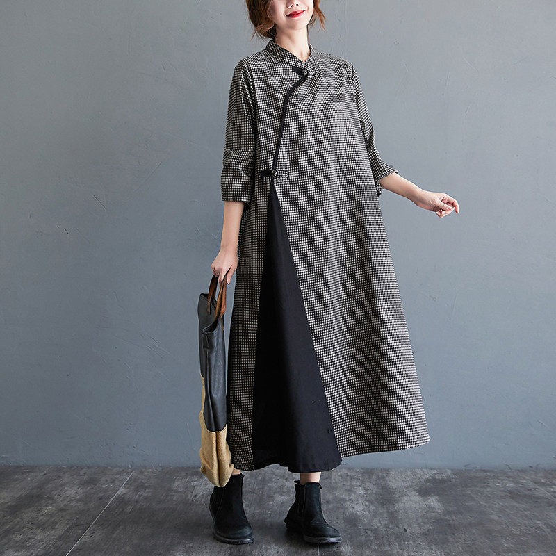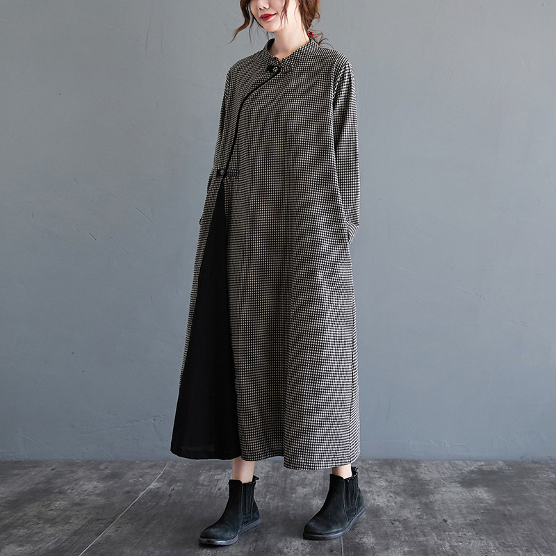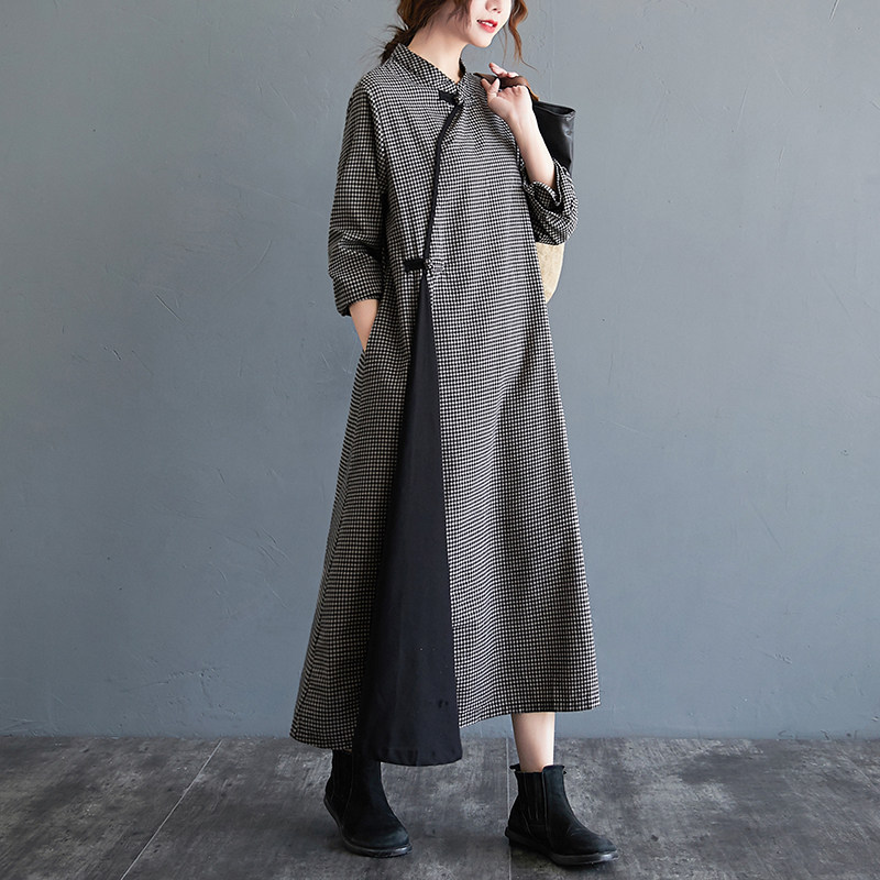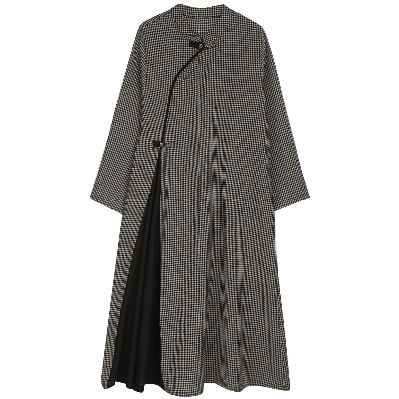 实拍捡漏春秋季新款文艺森系格子盘扣旗袍连衣裙女大码复古减龄