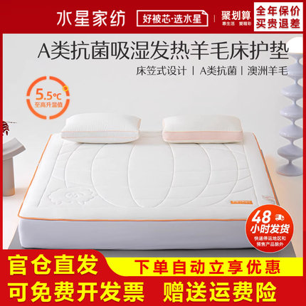 水星家纺A类抗菌防螨床笠式防滑垫被热力暖·吸湿发热羊毛床护垫