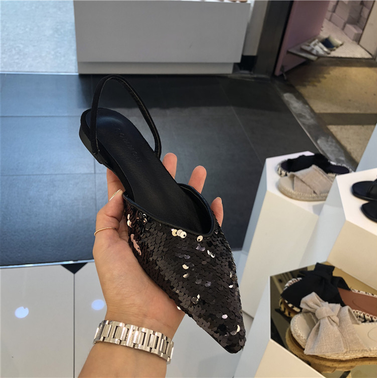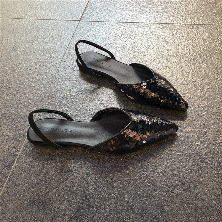 韩国女鞋琪琪2022春夏新款韩版公主亮片尖头浅口后空绊带低跟单鞋