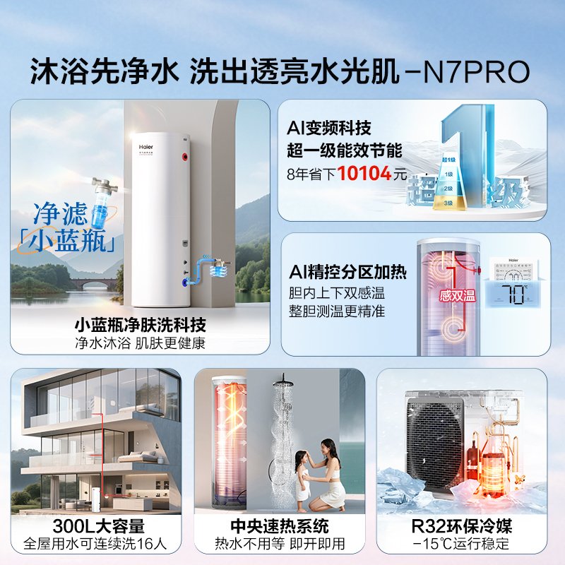 海尔空气能热水器300升家用商热泵小蓝瓶净水洗全变频大容量N7PRO