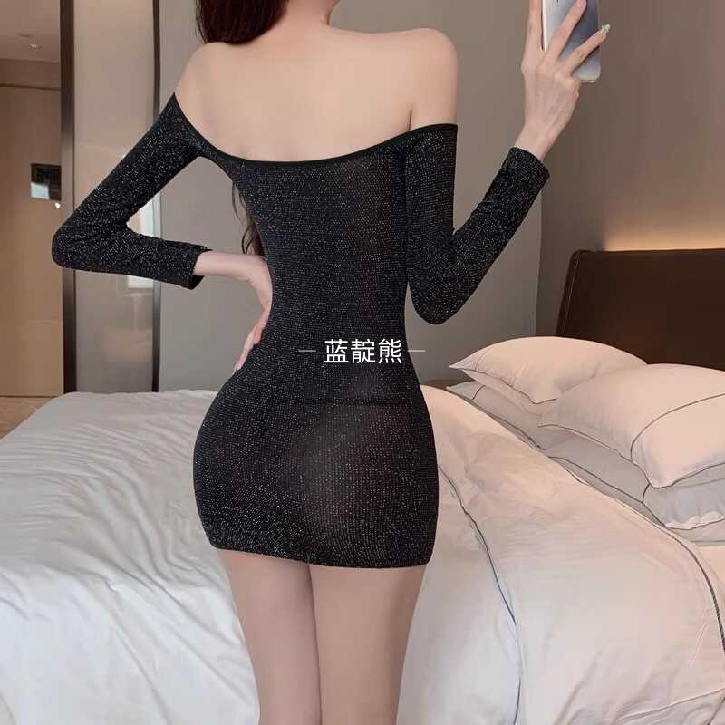 YM网红性感辣妹一字领闪闪紧身包臀小黑裙长袖包臀连衣裙睡衣女