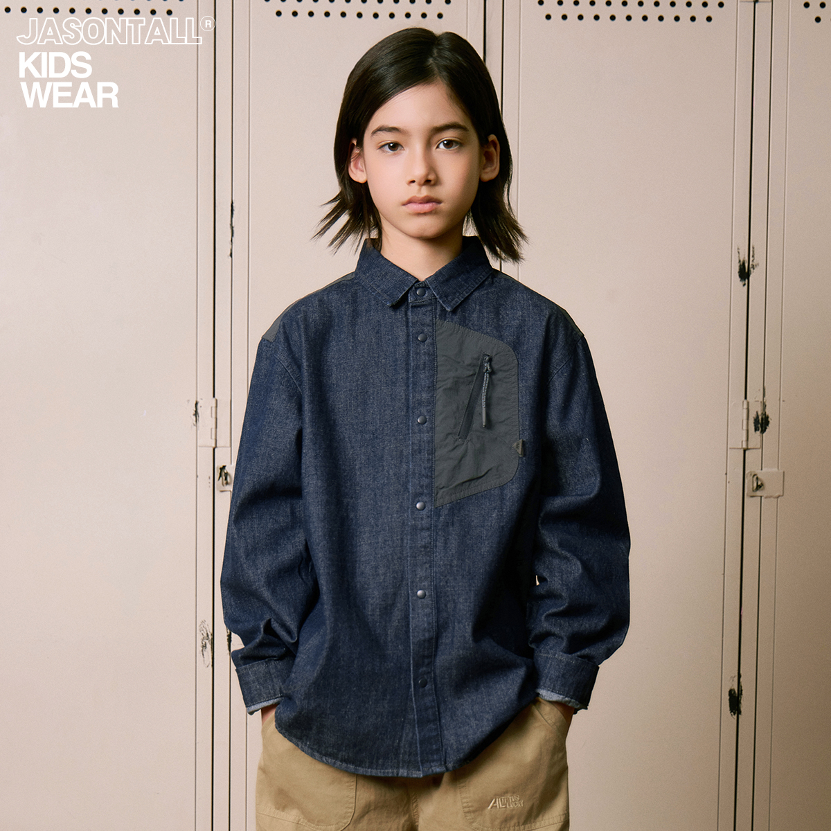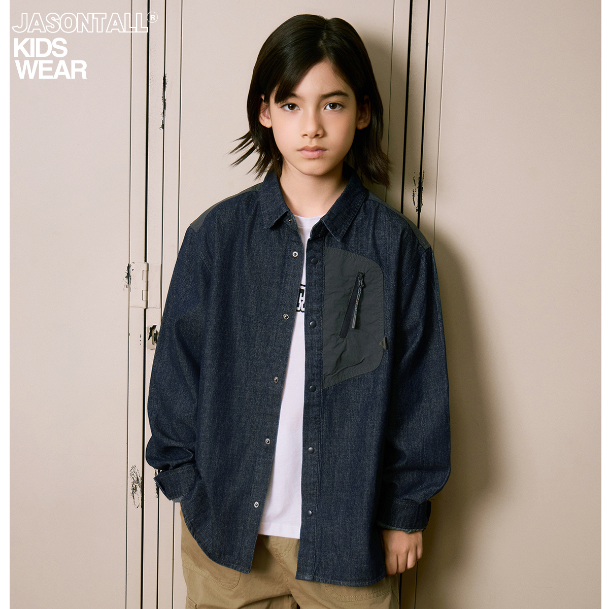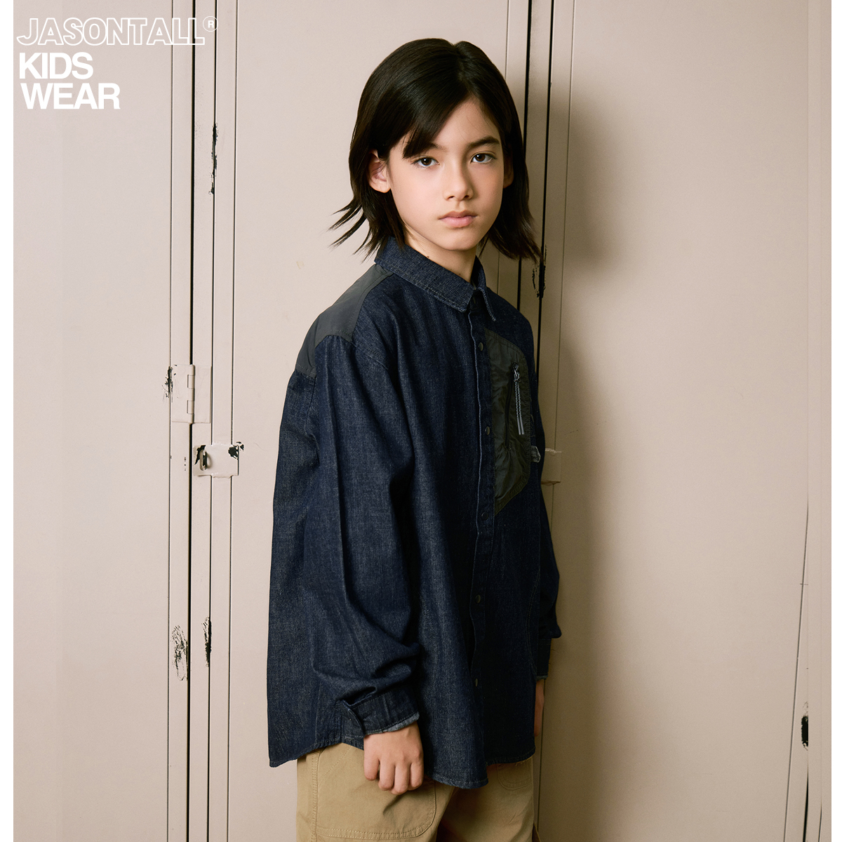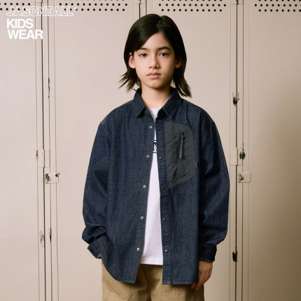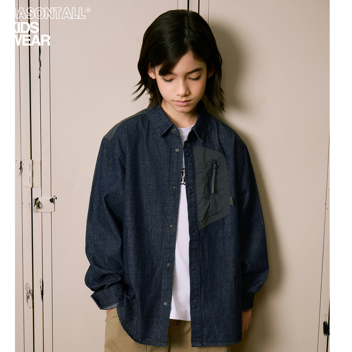 胸前口袋翻领长袖牛仔衬衫户外露营风宽松男女童装儿童上衣简约