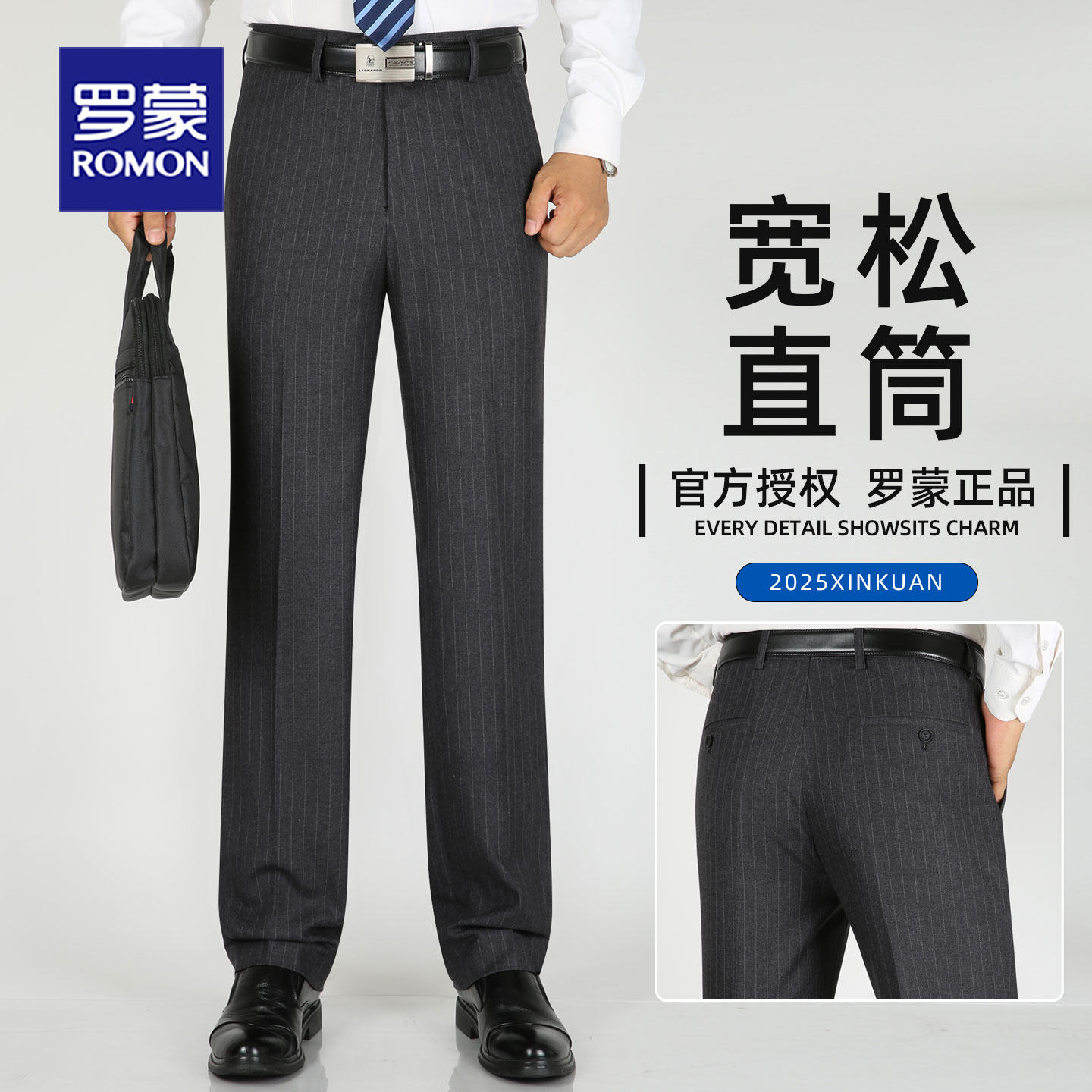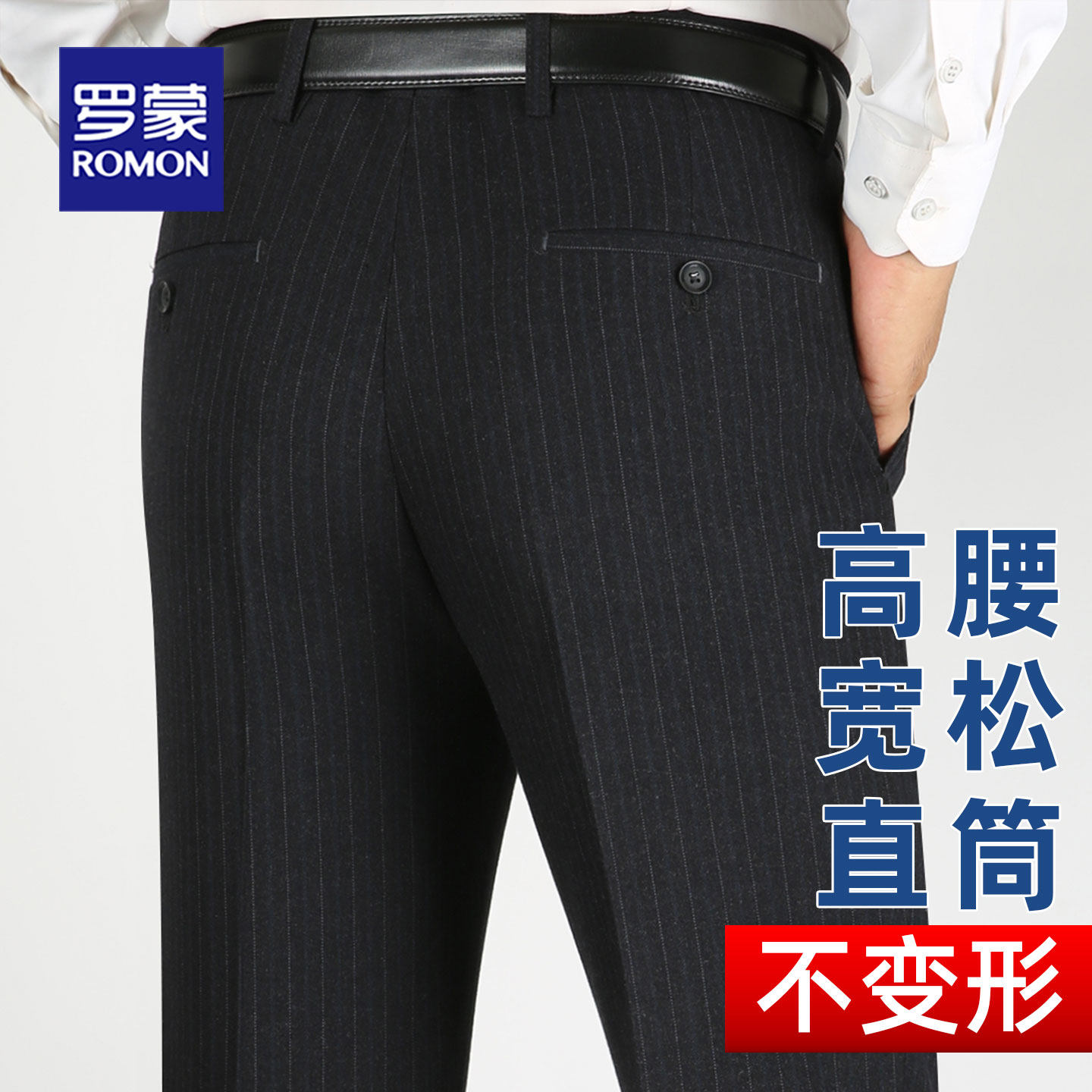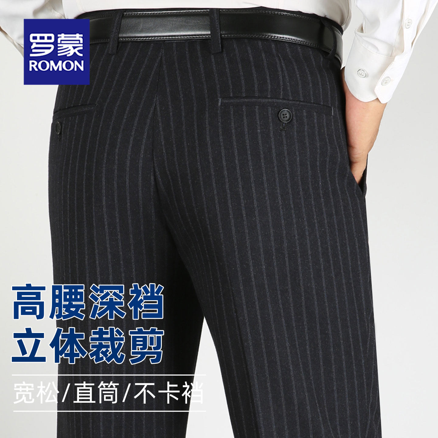 罗蒙男士毛呢西裤秋冬厚款中年宽松直筒高腰深档休闲条纹西装裤男