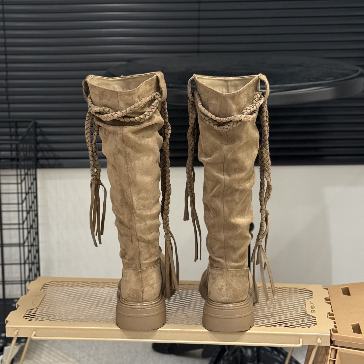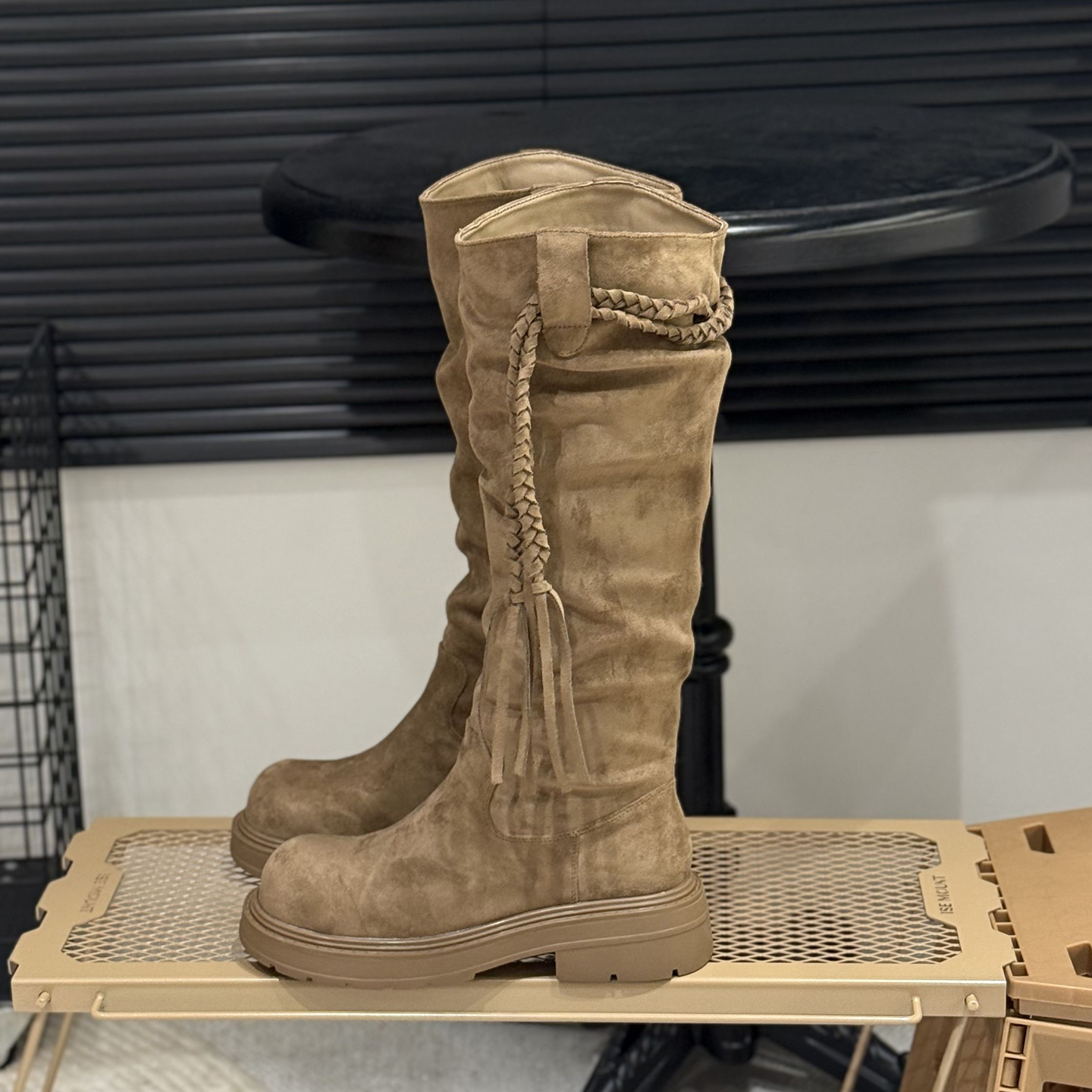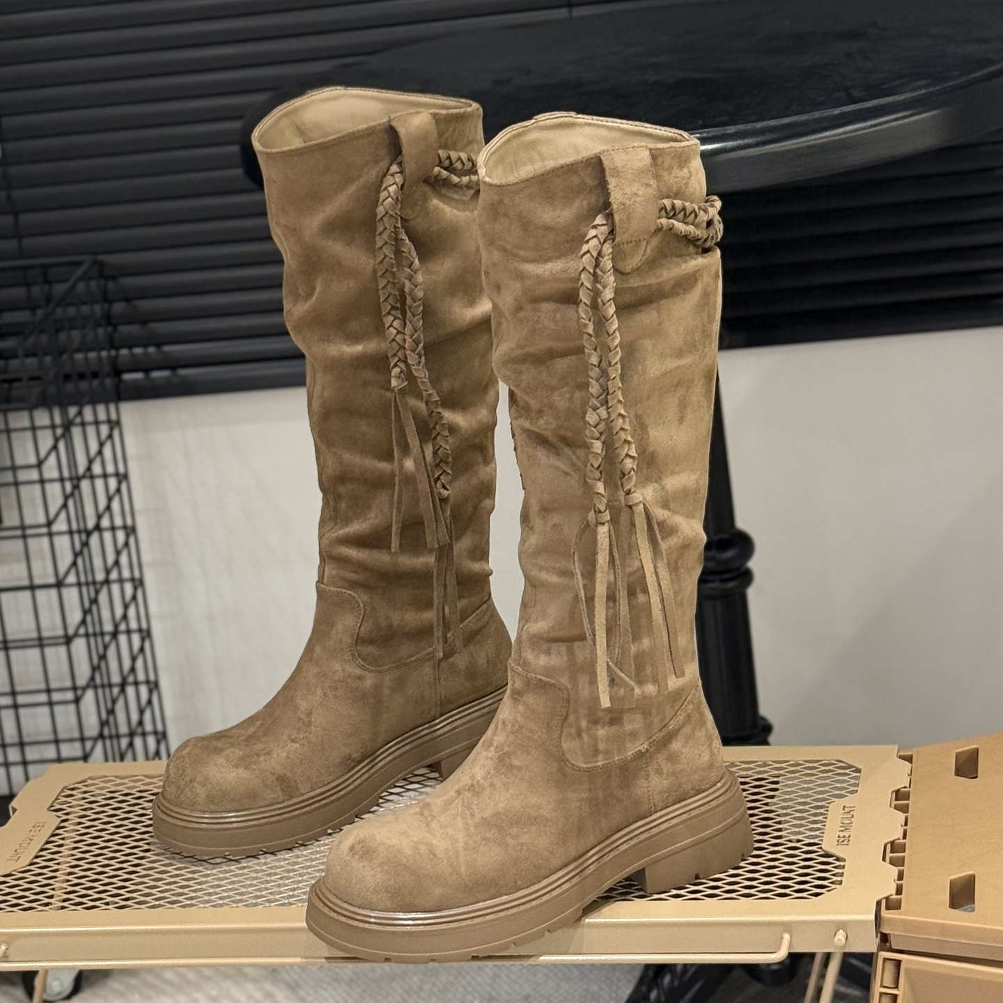 复古编织流苏高筒靴女骑士靴