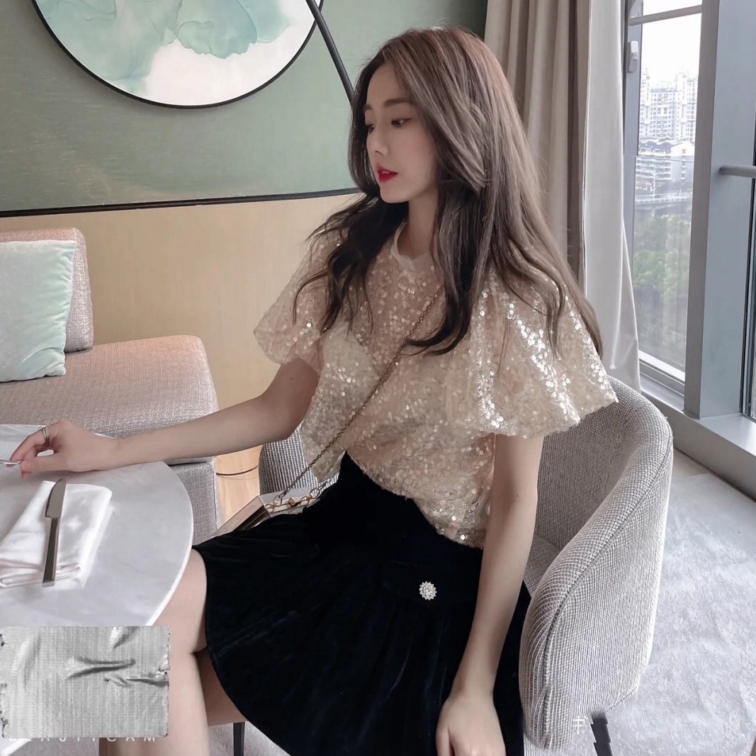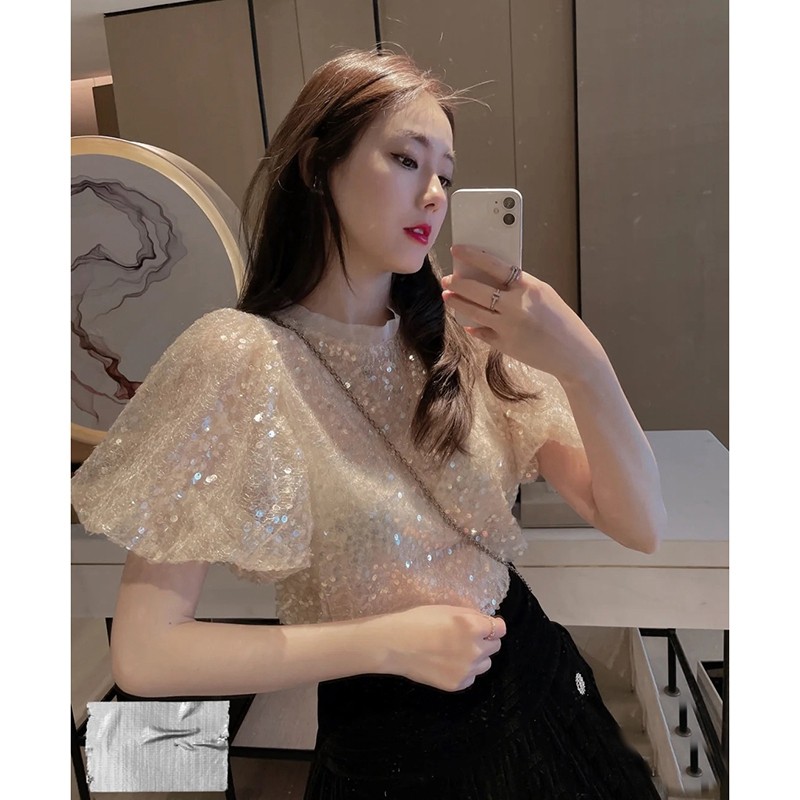 夏季「银光泡泡袖」短袖白色t恤女春夏2025新款潮蕾丝亮片上衣