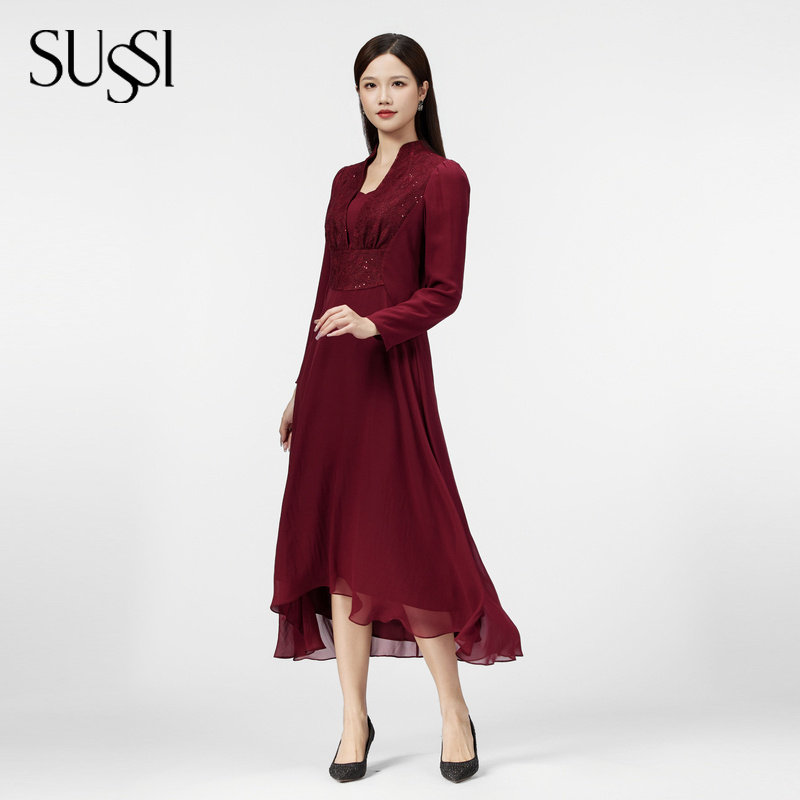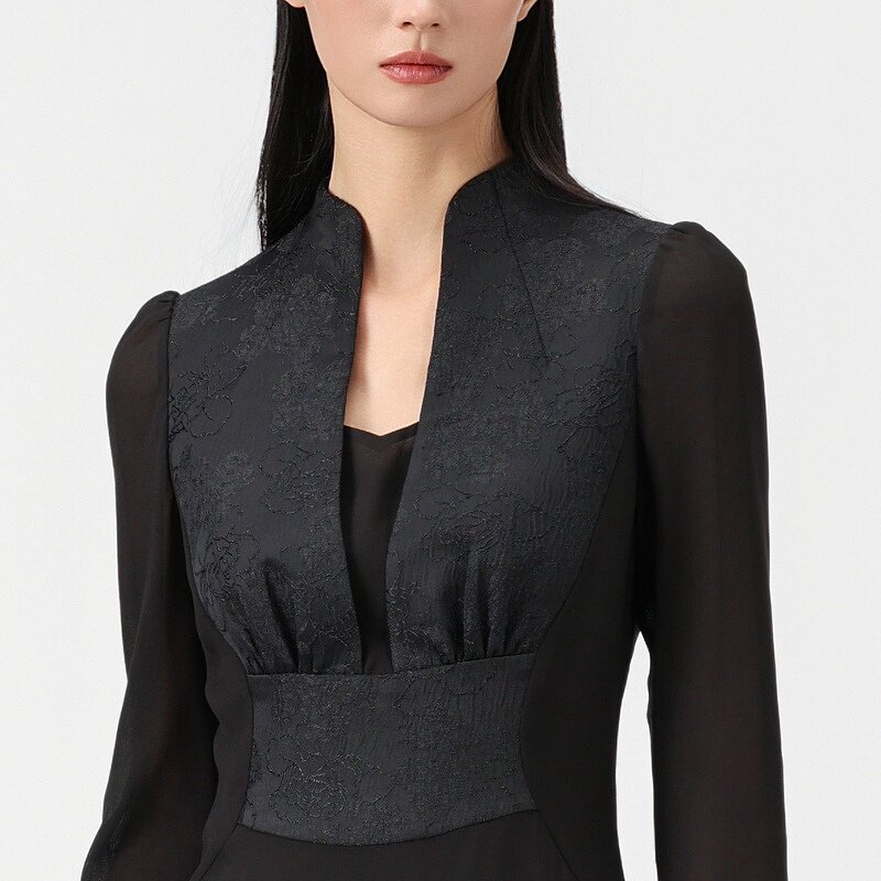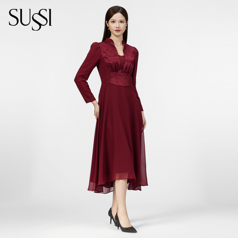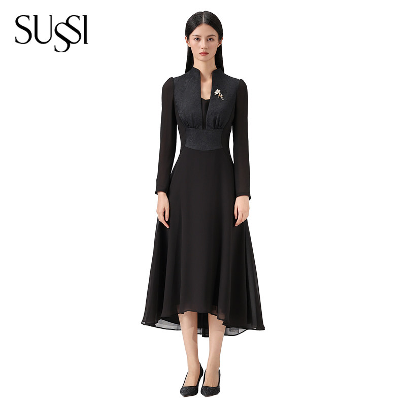 SUSSI/古色25夏商场同款连身立领泡泡长袖经典X型连衣裙