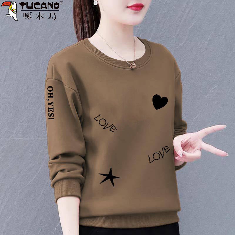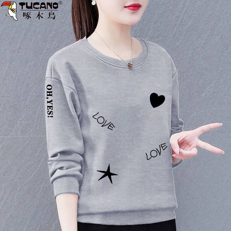啄木鸟纯棉卫衣女秋冬新款加绒百搭宽松显瘦印花圆领长袖体恤衫女
