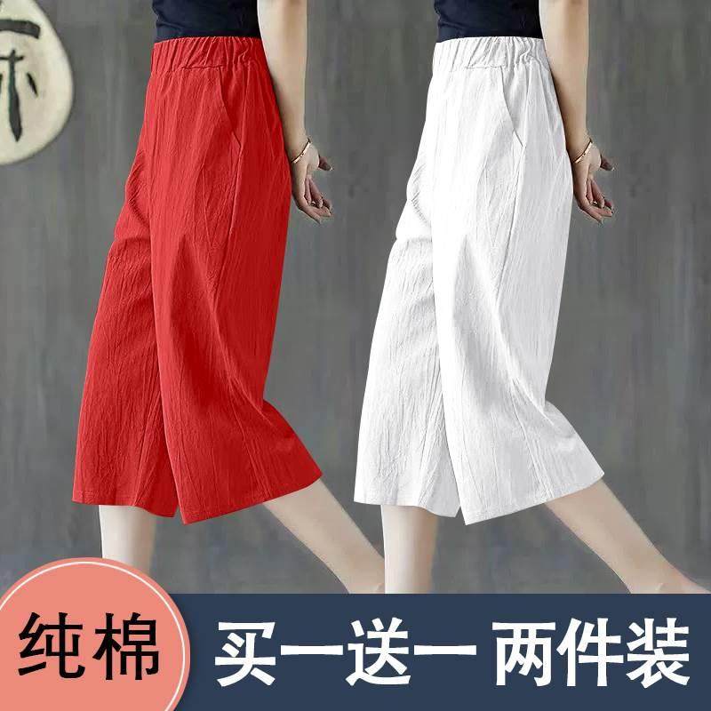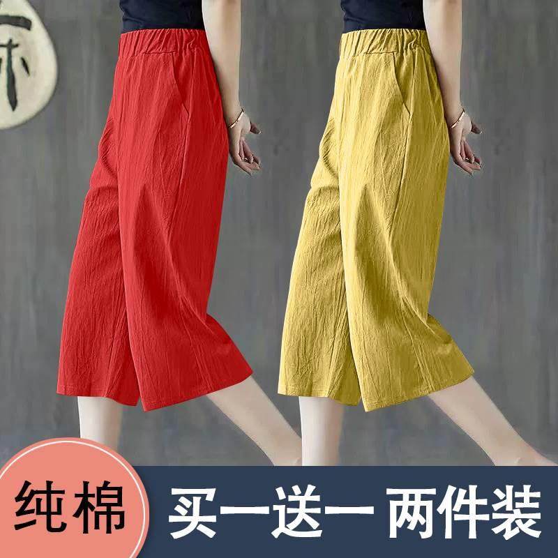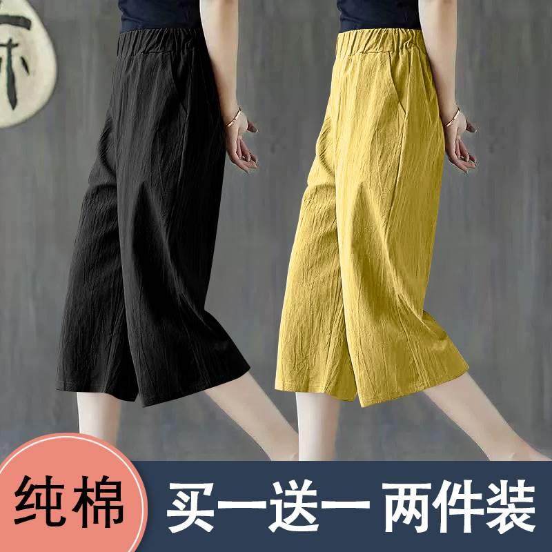 棉麻阔腿裤女夏季高腰休闲七分裤