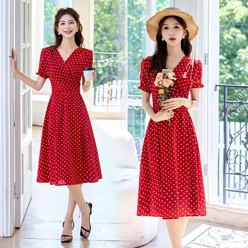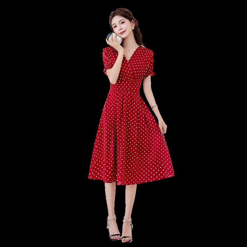 红色波点雪纺连衣裙女装2025夏季新款法式气质收腰显瘦中长款裙子