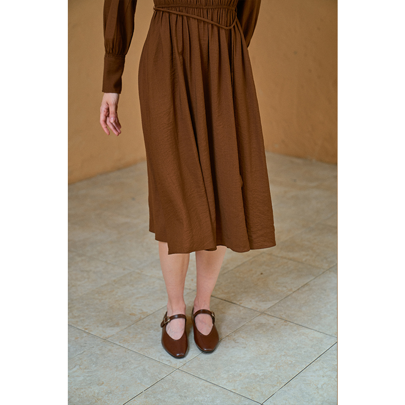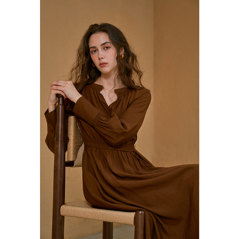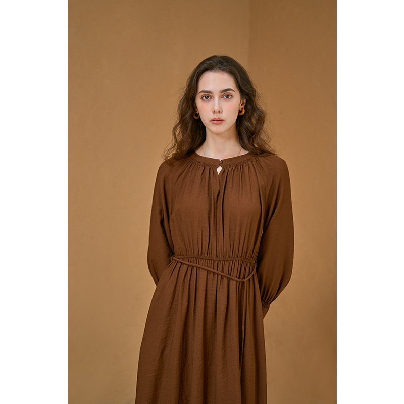 HeyDress法式连衣裙女春季宽松圆领花瓣腰带设计气质垂感长袖裙子