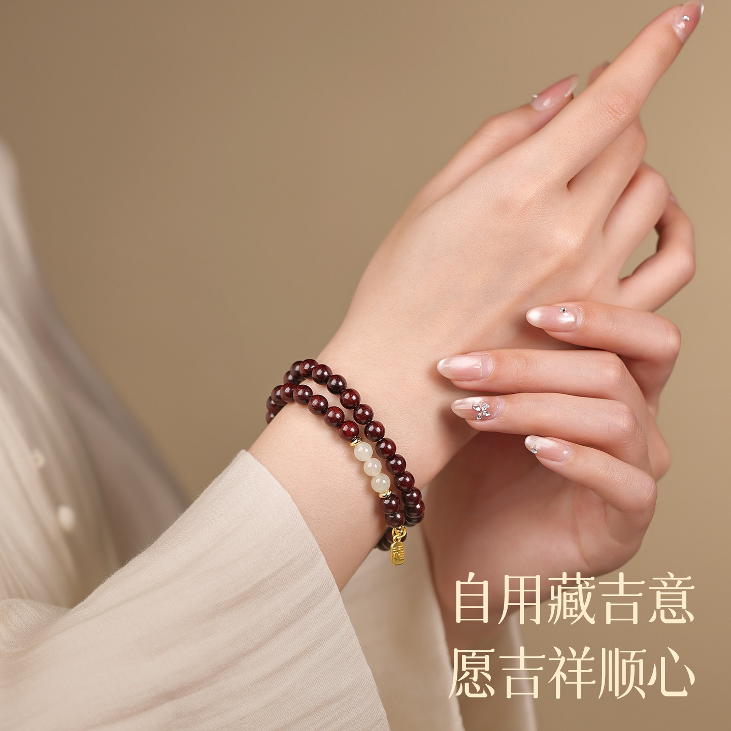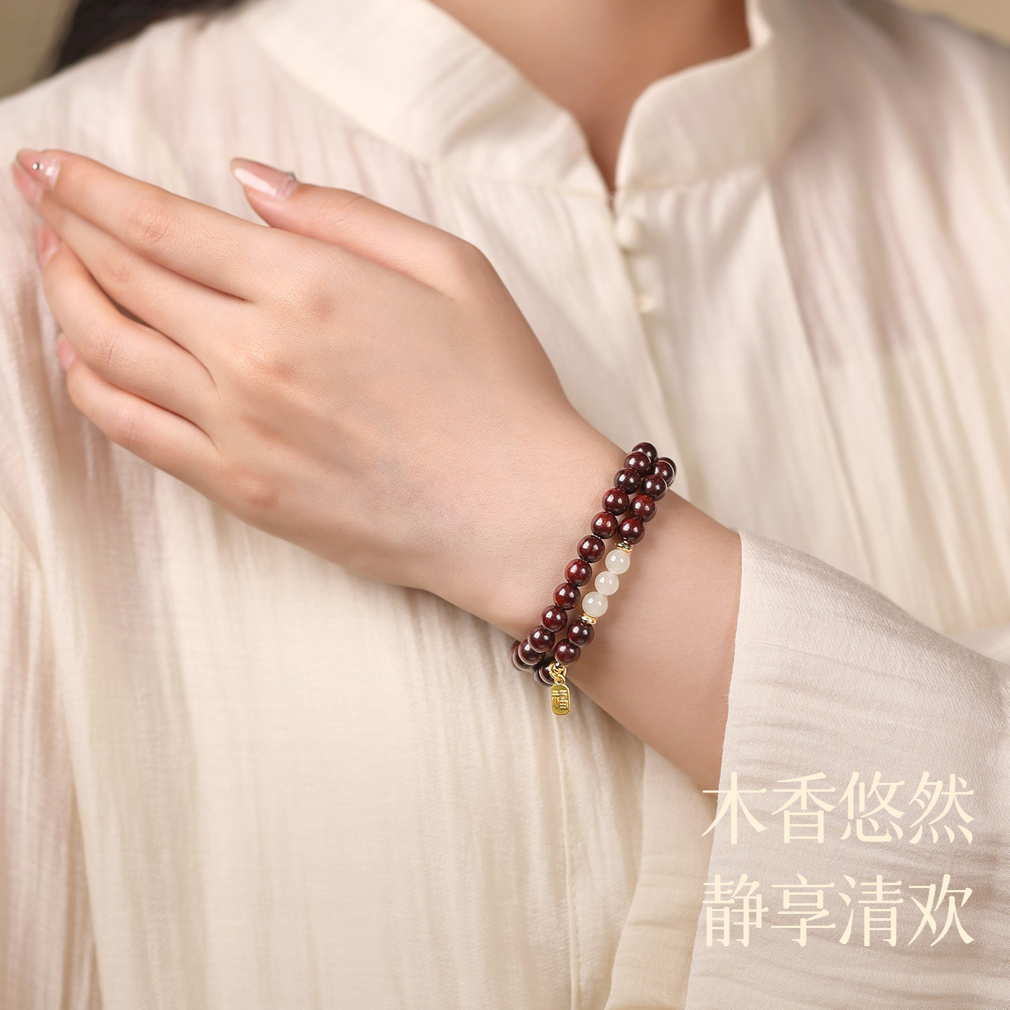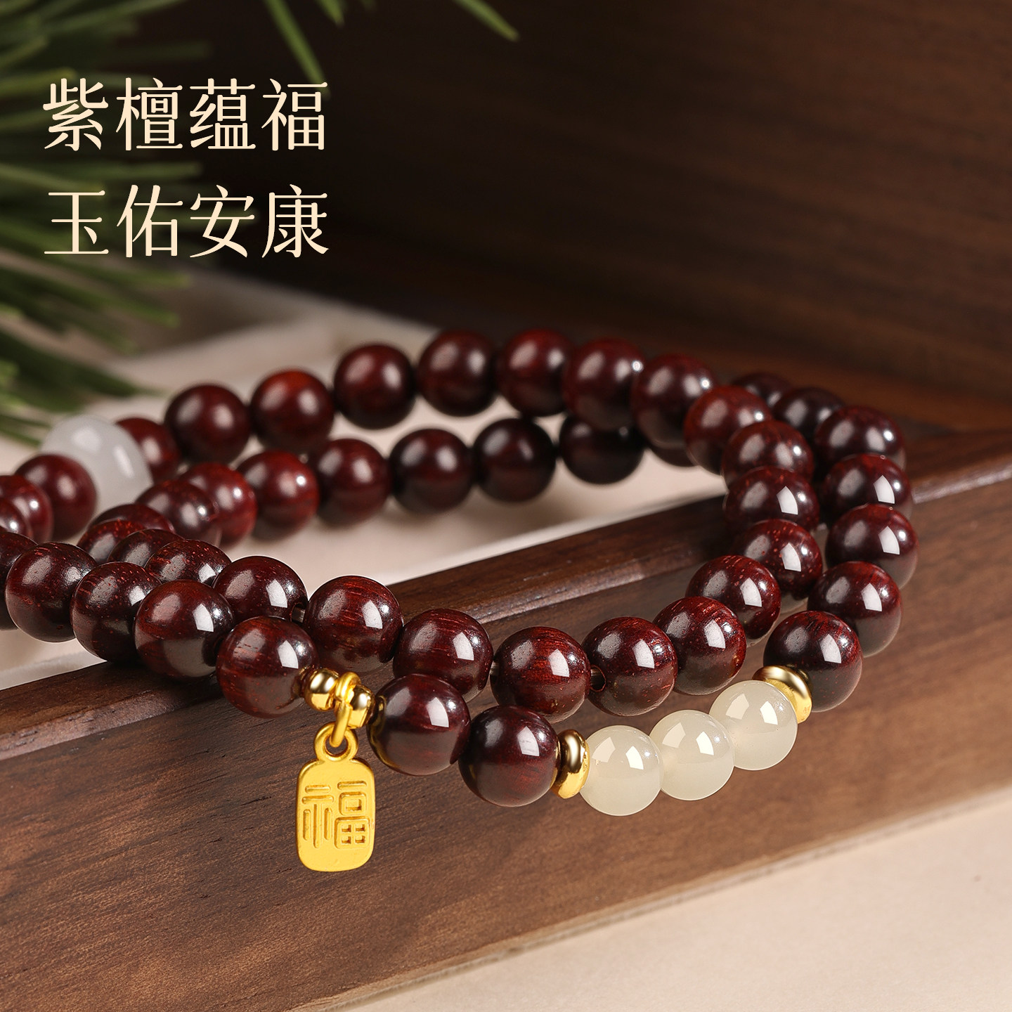 吉照堂天然和田玉手链正品小叶紫檀手串女转运珠双圈手串叠戴佛珠