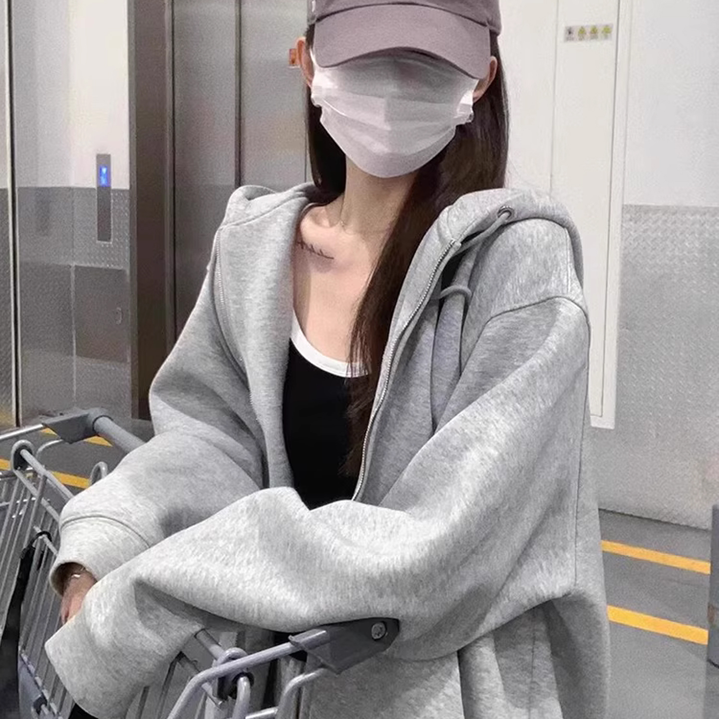 美式慵懒chic巨好看的女士卫衣2025新款早秋冬季灰色加绒拉链外套