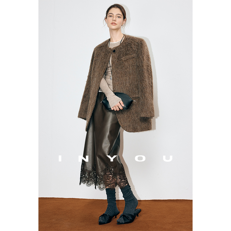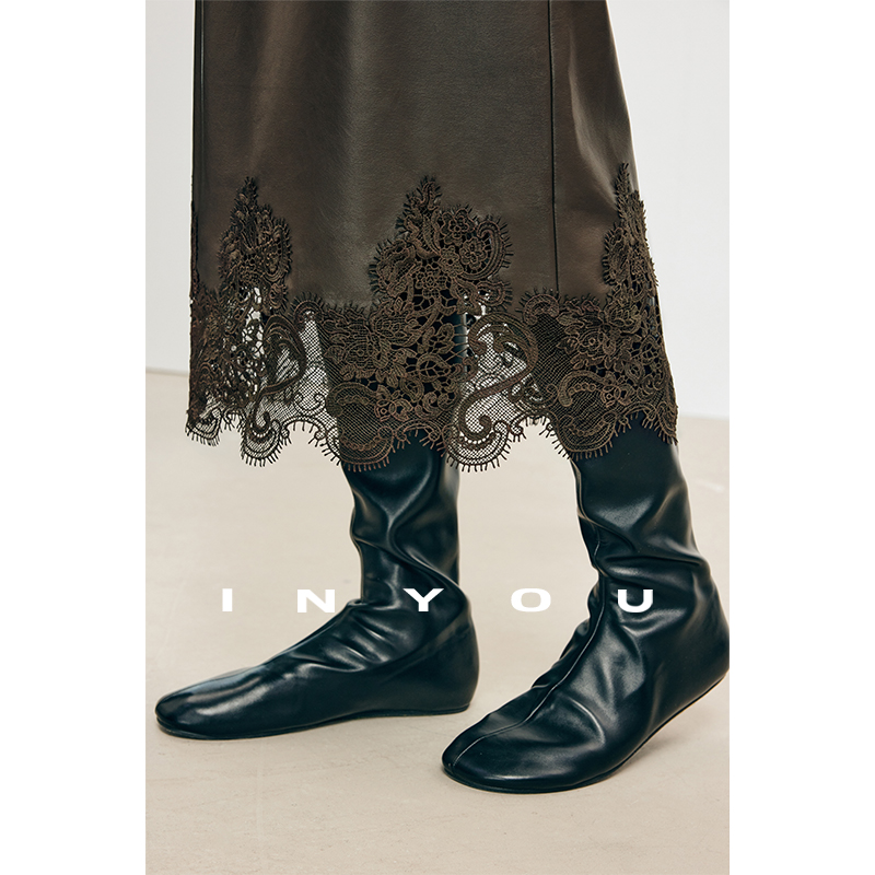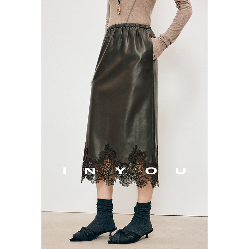 因由 时髦雾面蕾丝拼接设计感蛋白环保皮中长款直筒半身裙女秋冬